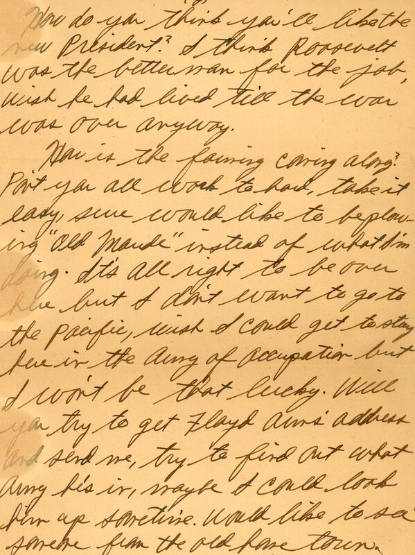 How is the family coming along? Don't you all work to hard, take it easy, sure would like to be plowing "Old Maude" instead on what I'm doing. It's all right to be over here but I don't want to go to the pacific, wish I could get to stay here in the army of occupation but I won't be that lucky. Will you try to get Floyd [ineligible] address and send me, try to find out what army he's in, maybe I could look him up sometime. Would like to see someone from the old home town.