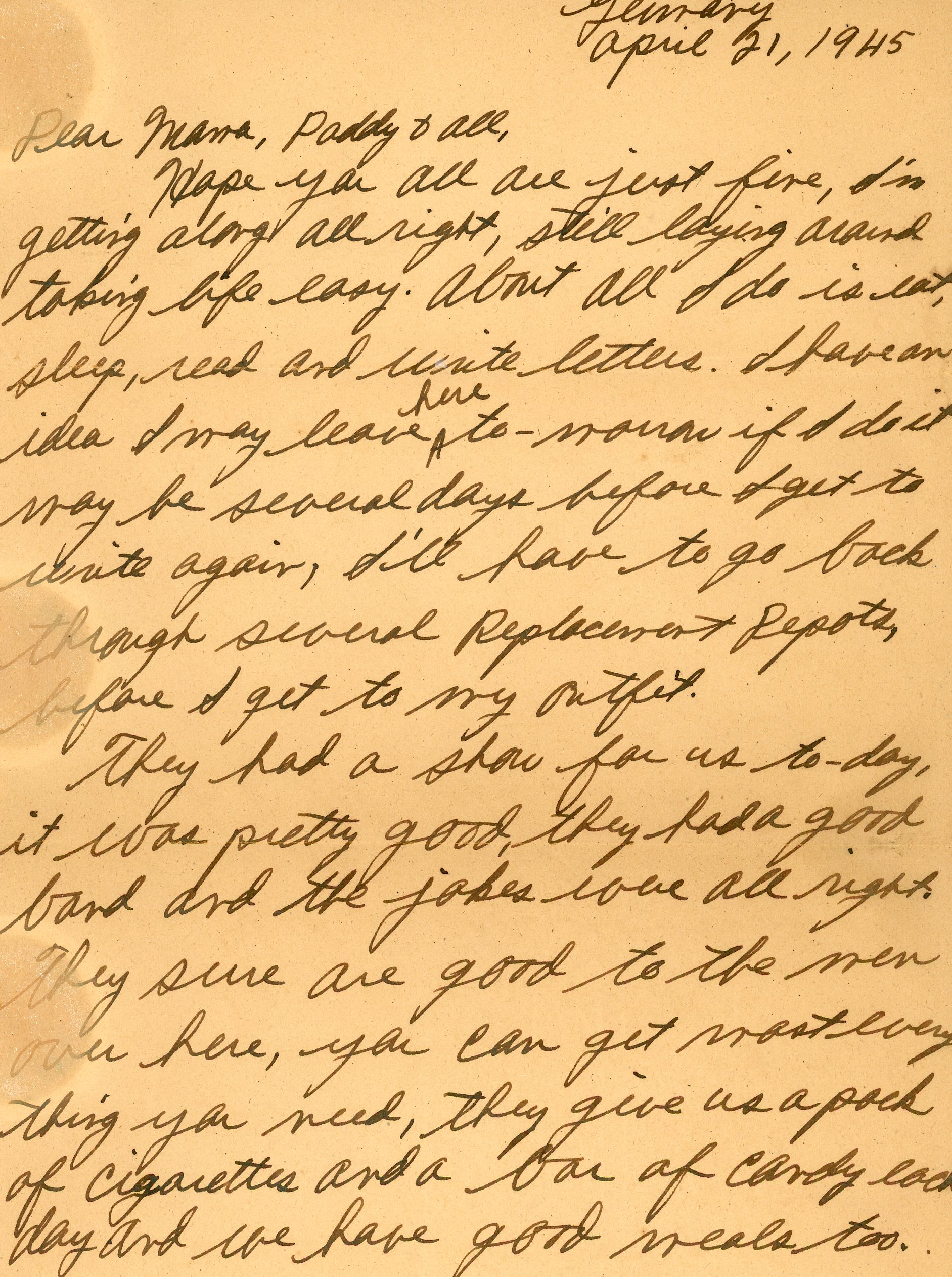 They had a show for us to-day, it was pretty good, they had a good band and the jokes were all right. They sure are good to the men over here, you can get most everything you need, they give us a pack of cigarettes and a bar of candy each day and we have good meals too. How do you think you'll like the new President? I think Roosevelt was the better man for the job, wish he had lived till the war was over anyway.