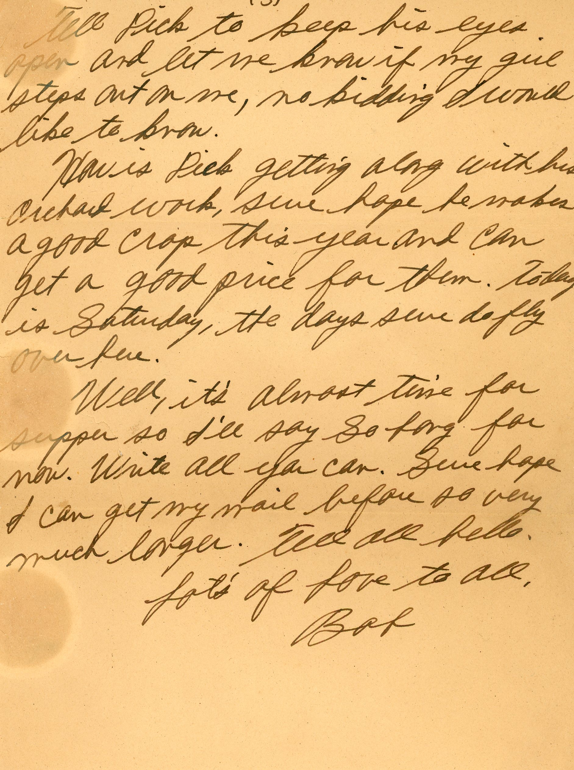 How is Dick getting along with his orchard work, sure hope he makes a good crop this year and can get a good price for them. To-day is Saturday, the days sure do fly over here.