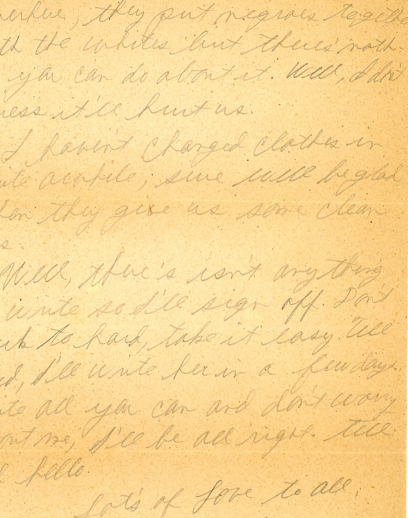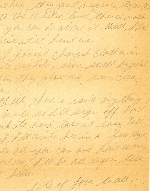 Well, there's isn't anything to write so I'll sign off. Don't work to hard, take it easy. Tell Fred, I'll write her in a few days. Write all you can and don't worry about me, I'll be all right. Tell all hello.