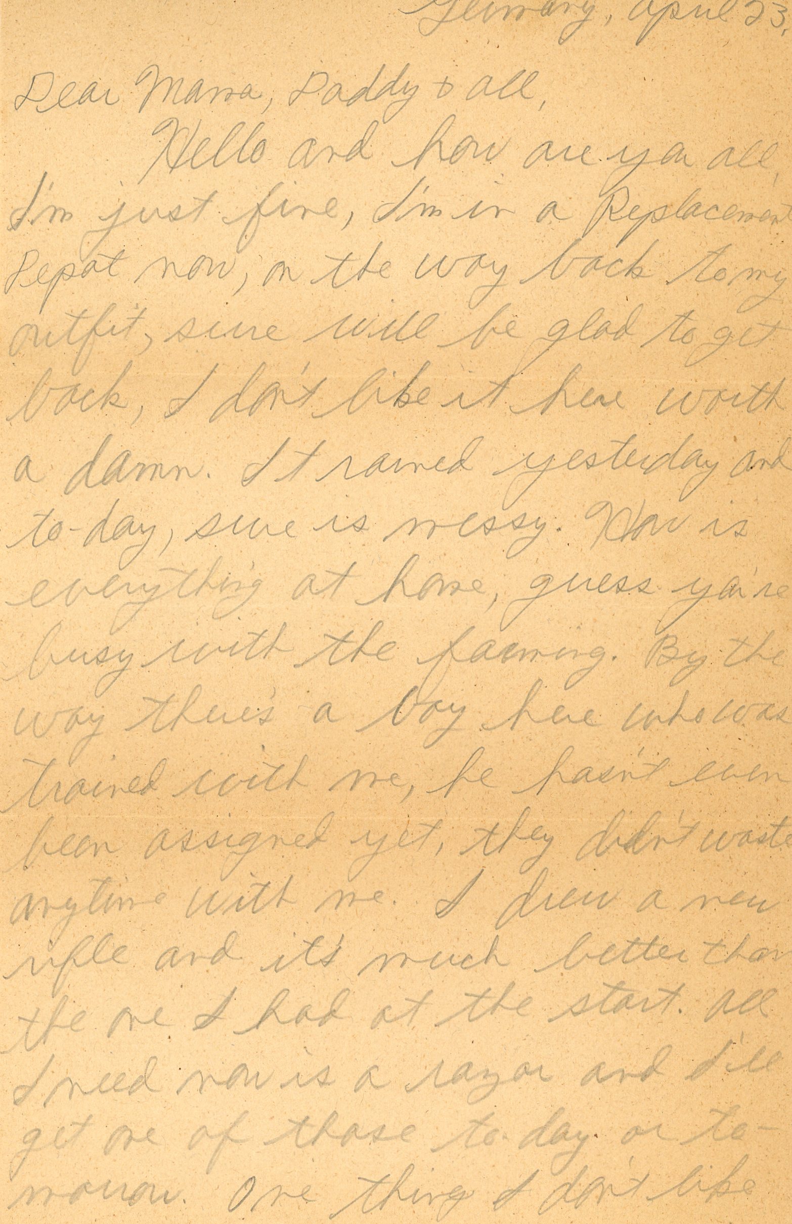 Hello and how are you all, I'm just fine, I'm in a Replacement Depot now, on the way back to my outfit, sure will be glad to get back, I don't like it here worth a damn. It rained yesterday and to-day, sure is messy. How is everything at home, guess you're busy with the farming. By the way there's a boy here who was trained with me, he hasn't even been assigned yet, they didn't waste anytime with me. I drew a new rifle and it's much better than the one I had at the start. All I need now is a razor and I'll get one of those to-day or to-morrow. One thing I don't like over here, they put negroes together with the whites but there's nothing you can do about it. Well, I don't guess it'll hurt us.