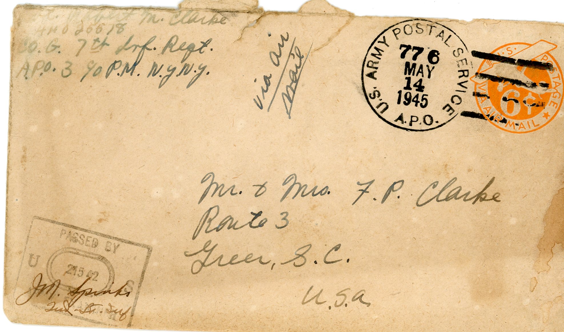 Part of Robert M. Clarke letters: envelope, from Bob via airmail, May 14, 1945