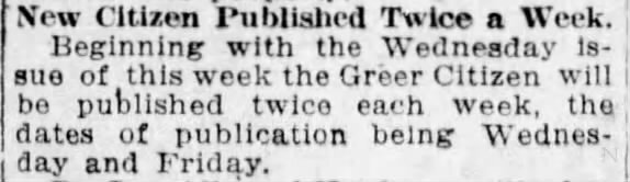 The Greer Citizen was the longest-running of Greer's four newspapers; its first issue published on May 10, 1918.