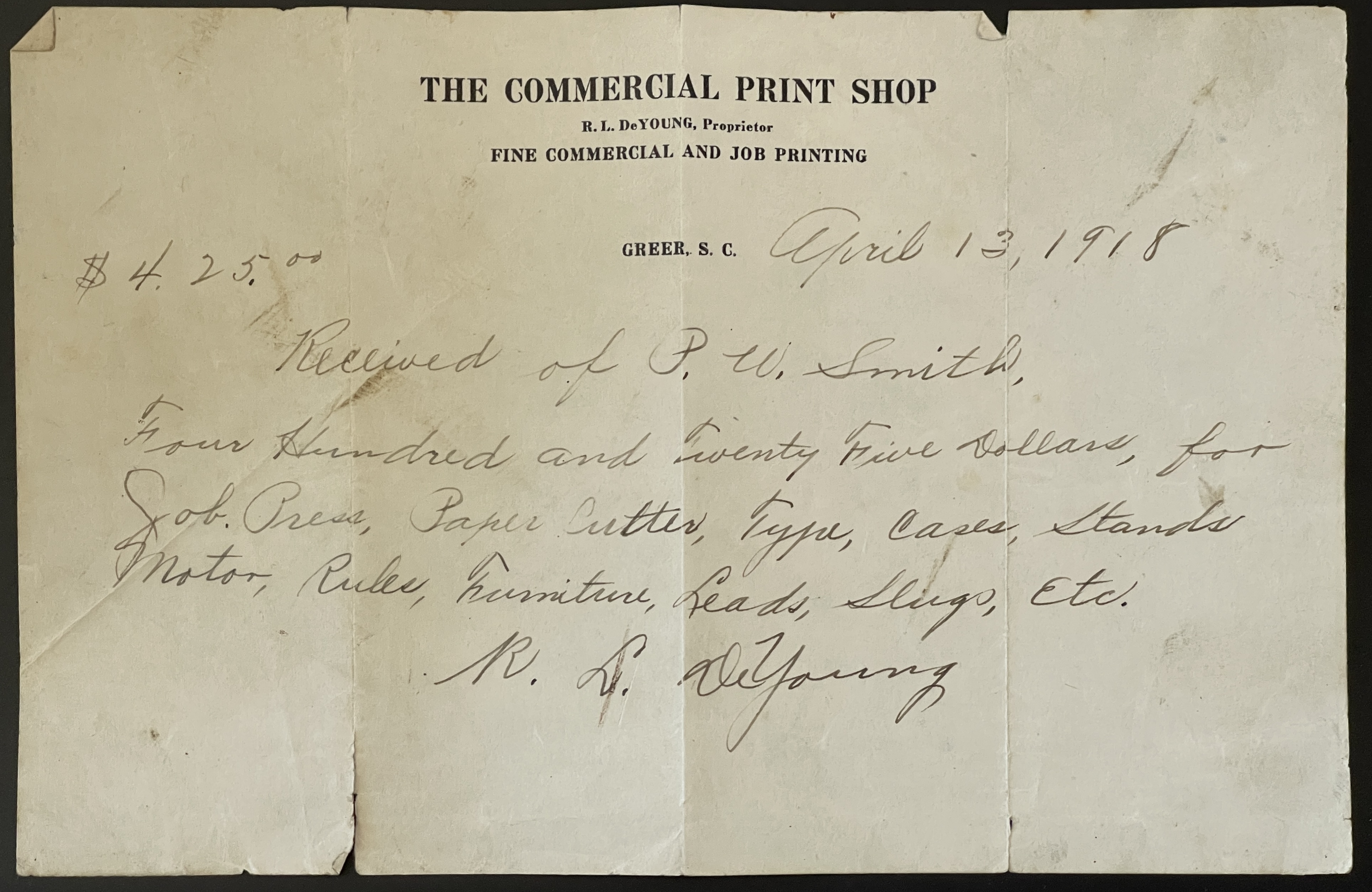 The Greer Citizen was founded as the Greer Observer in June, 1905, and began publication around July 1. It ceased publication about 1915; it might have had a very short-life restart under new owners in 1917. In 1918 the building and equipment were purchased by Preston Webb (P. W.) Smith and then reopened as Greer Citizen with first publication on May 10, 1918. According to business records currently in possession of Smith descendants, P. W. Smith purchased equipment on April 13, 1918 from R. H. DeYoung, who had worked under Remsen. Greenville Daily News, May 2, 1918, reports that the Greer Observer weekly newspaper, which had not published for many months, had been purchased by W. P. Smith [sic], “a newspaper man of considerable reputation,” who had moved from Williamston to buy and operate the paper. The former editor, Lieut. N.C. Ramsey [sic], had been stationed at Camp Jackson (possibly the reason for the paper stopping). That was actually N.C. Remsen, who ended up as a captain and served overseas.