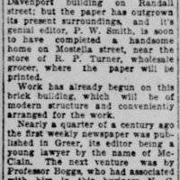 • Greer News-Leader was established in 1910 by a group of 10 men as a Democrat-viewpoint paper. That group included M. C. "Cliff" Davenport, son of D.D. Davenport, and he became president of the paper. It began semi-weekly, then went weekly after 1912. It ceased operation by 1915.
