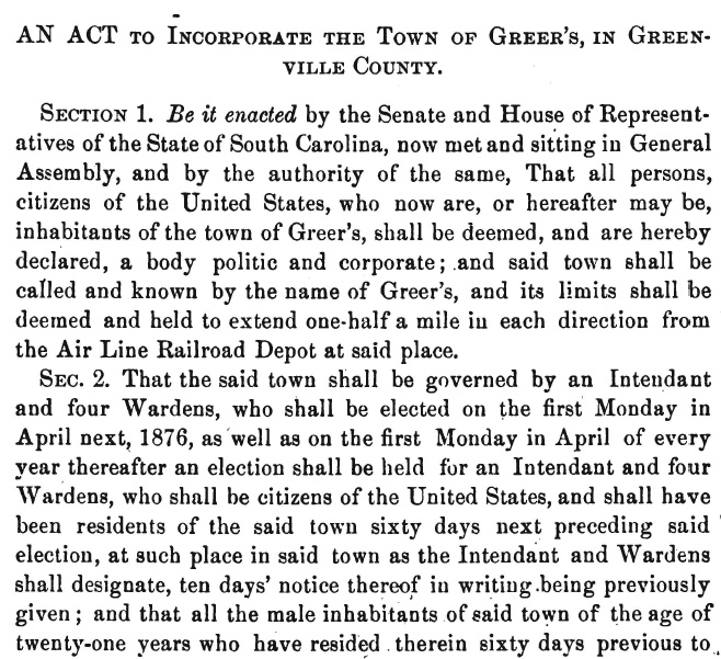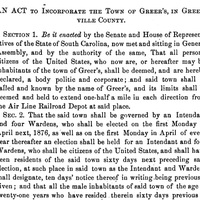 The state legislative act chartering the Town of Greer's, SC.