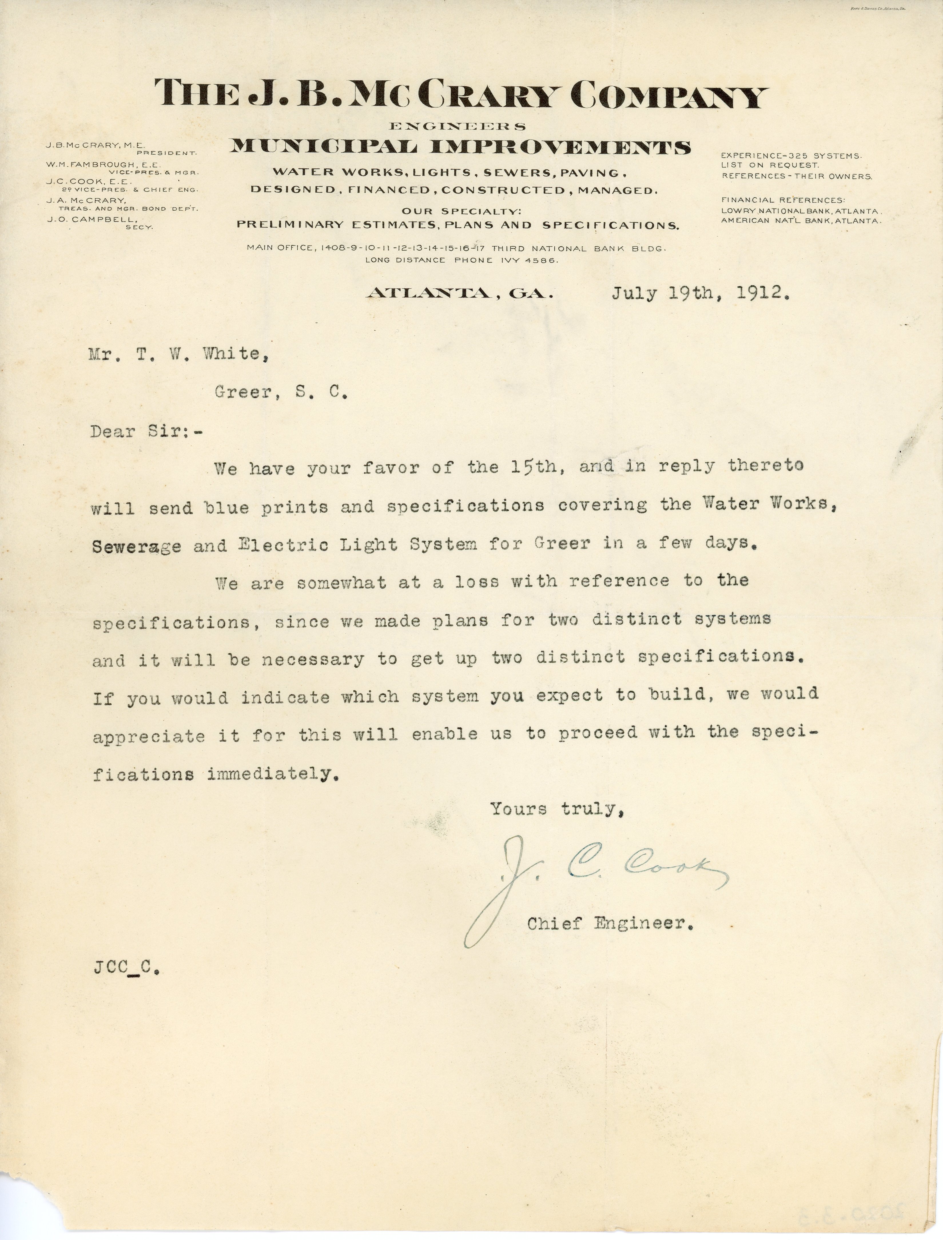 Letter 19 July 1912 J.B. McCrary Company to T.W. White