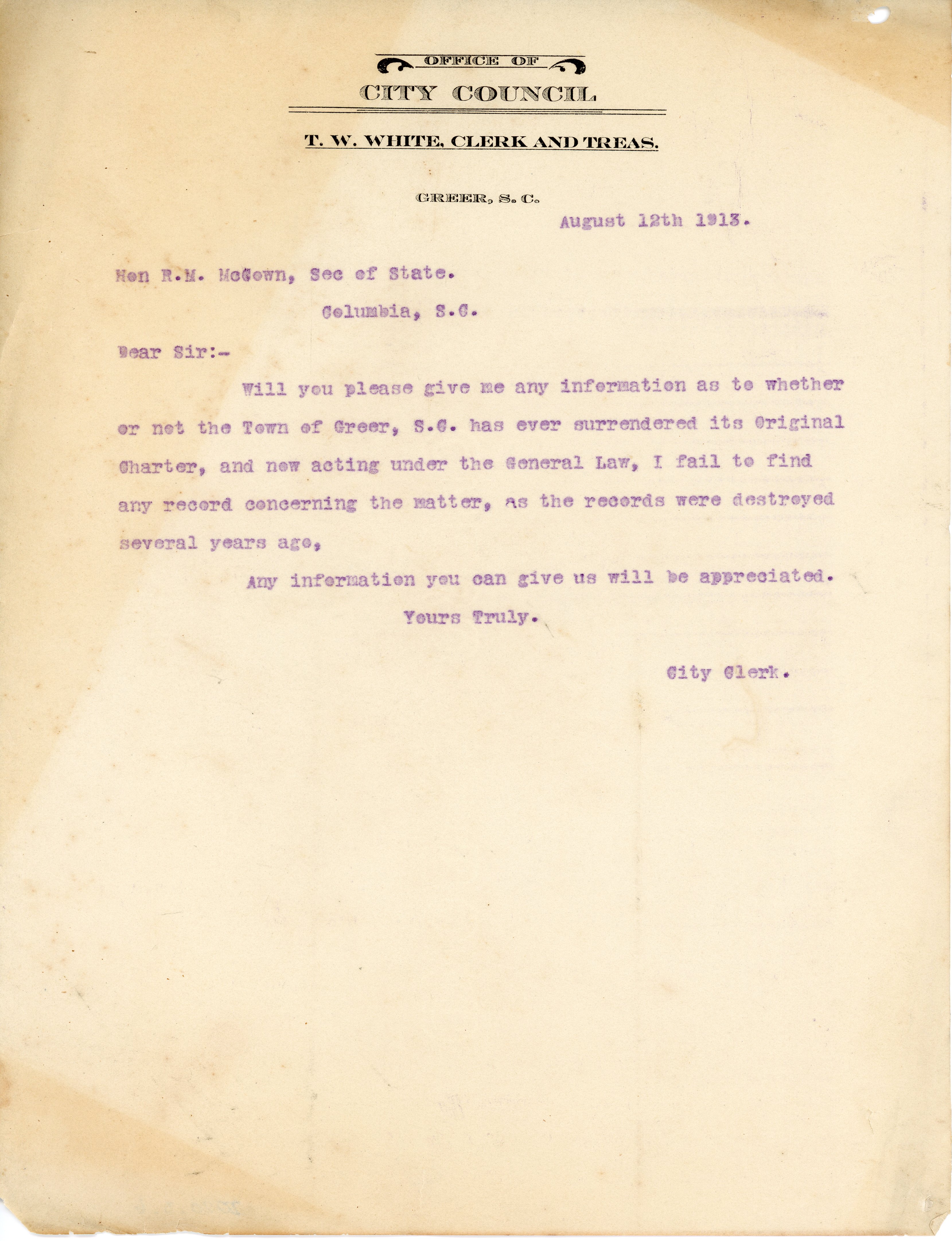 Letter 12 August 1913 T. W. White to Hon. R. M. McGown Secretary of State