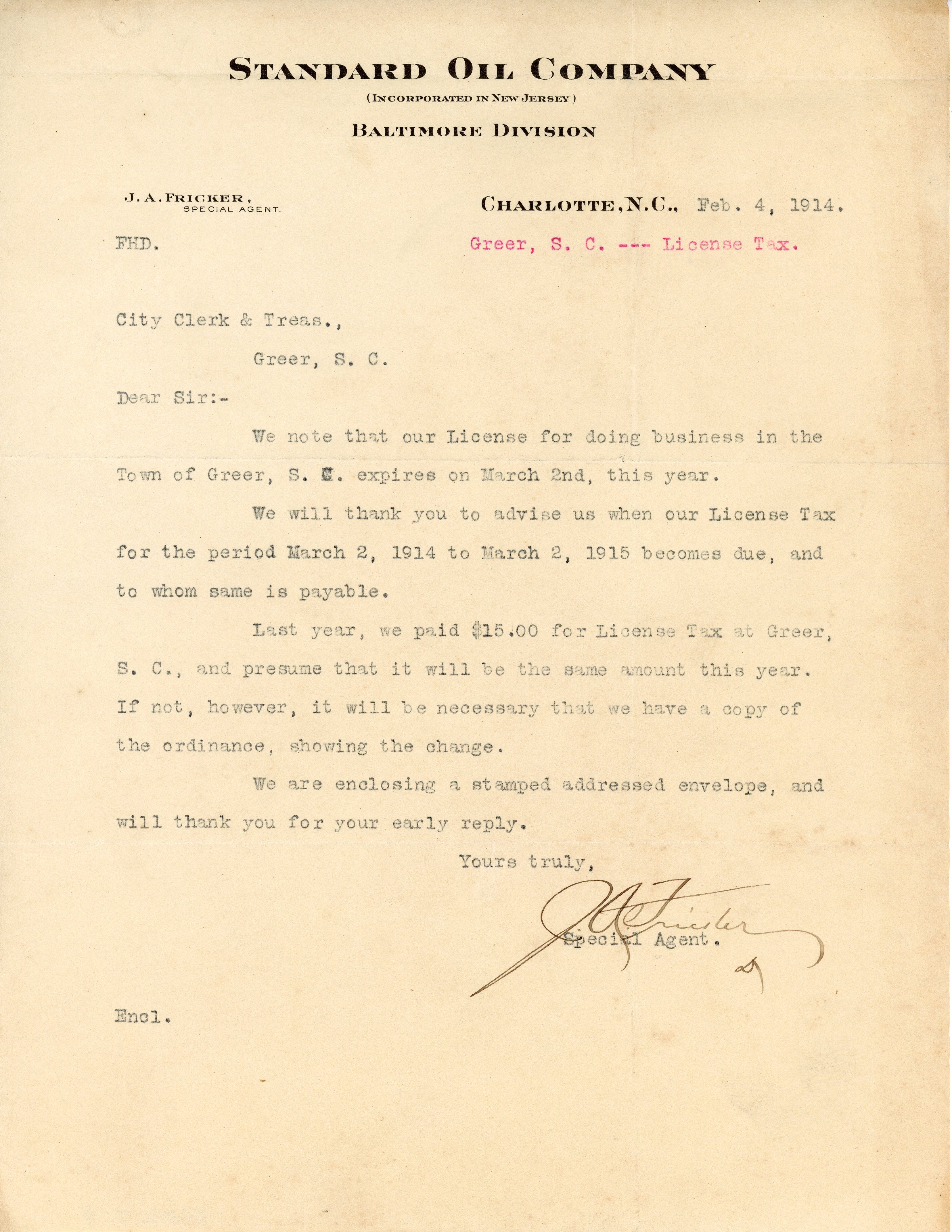 Letter 4 February 1914 Standard Oil Company to T. W. White