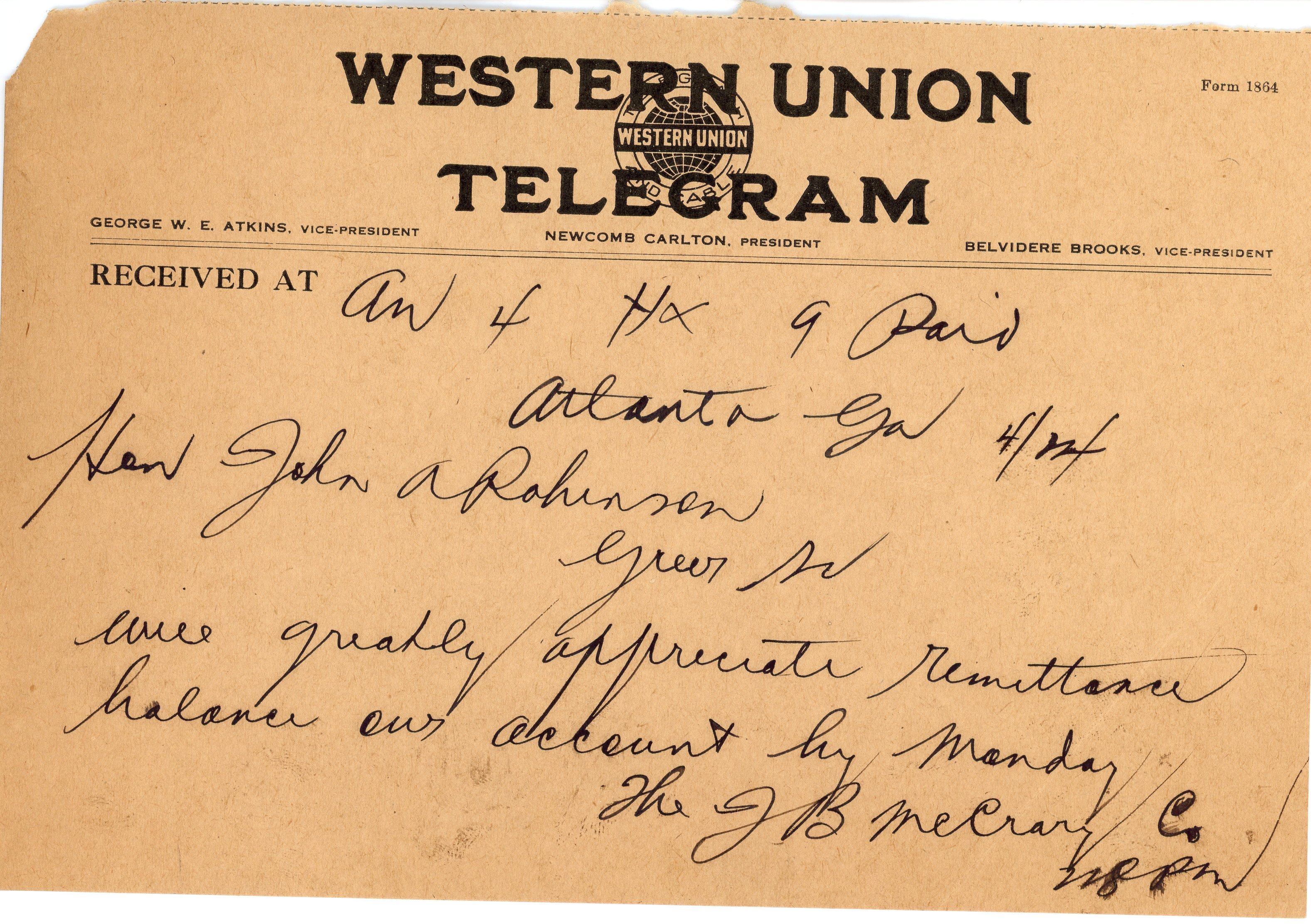 - Telegram 4 April 1914 J. B. McCrary to J. A. Robinson