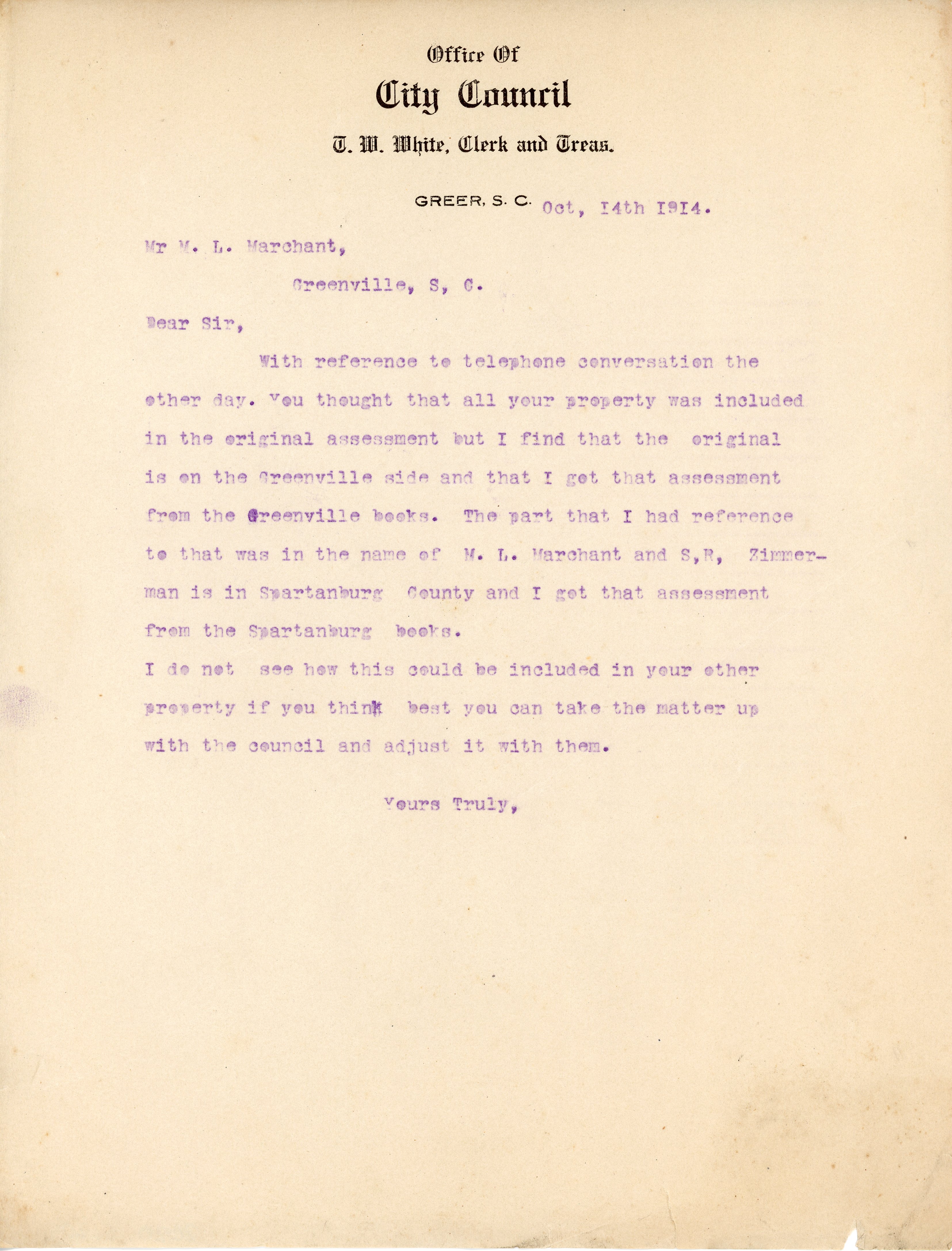Letter 14 October 1914 T. W. White to M. L. Marchant