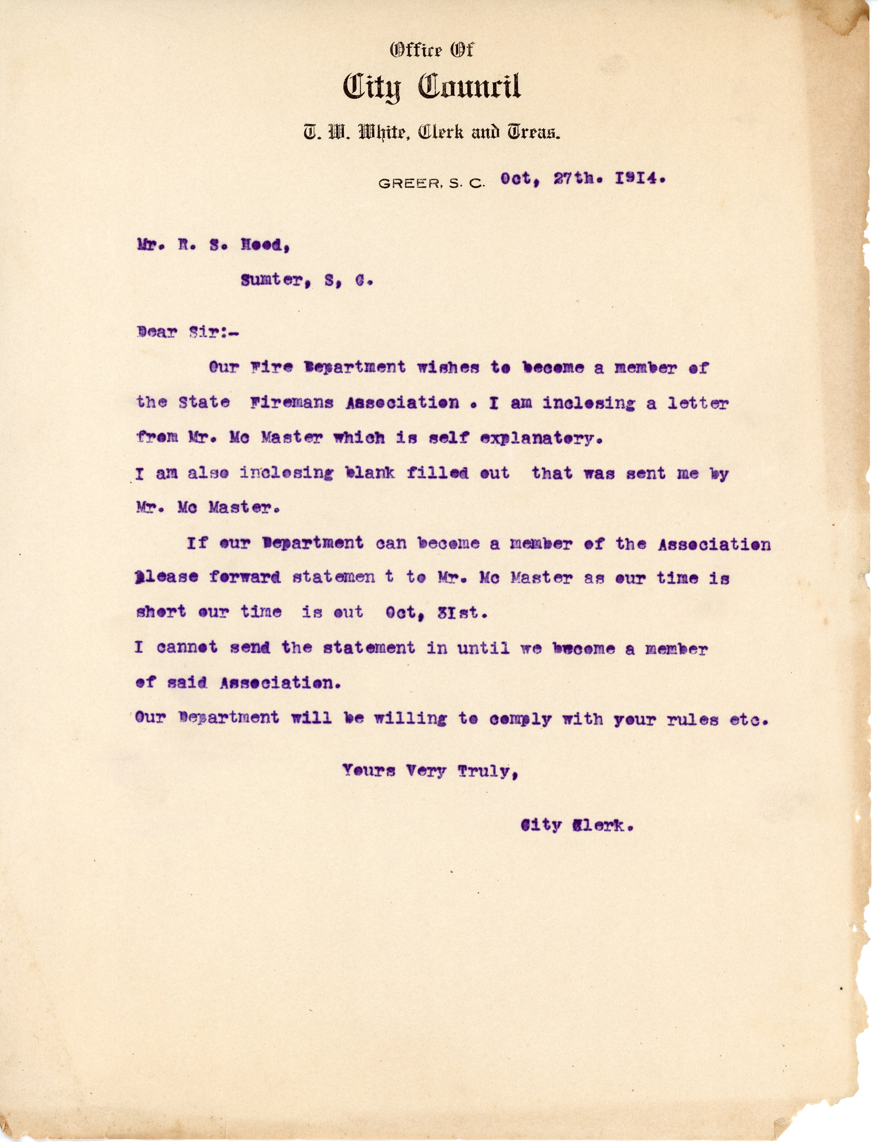 GREER, S.C. Oct, 27th. 1914.