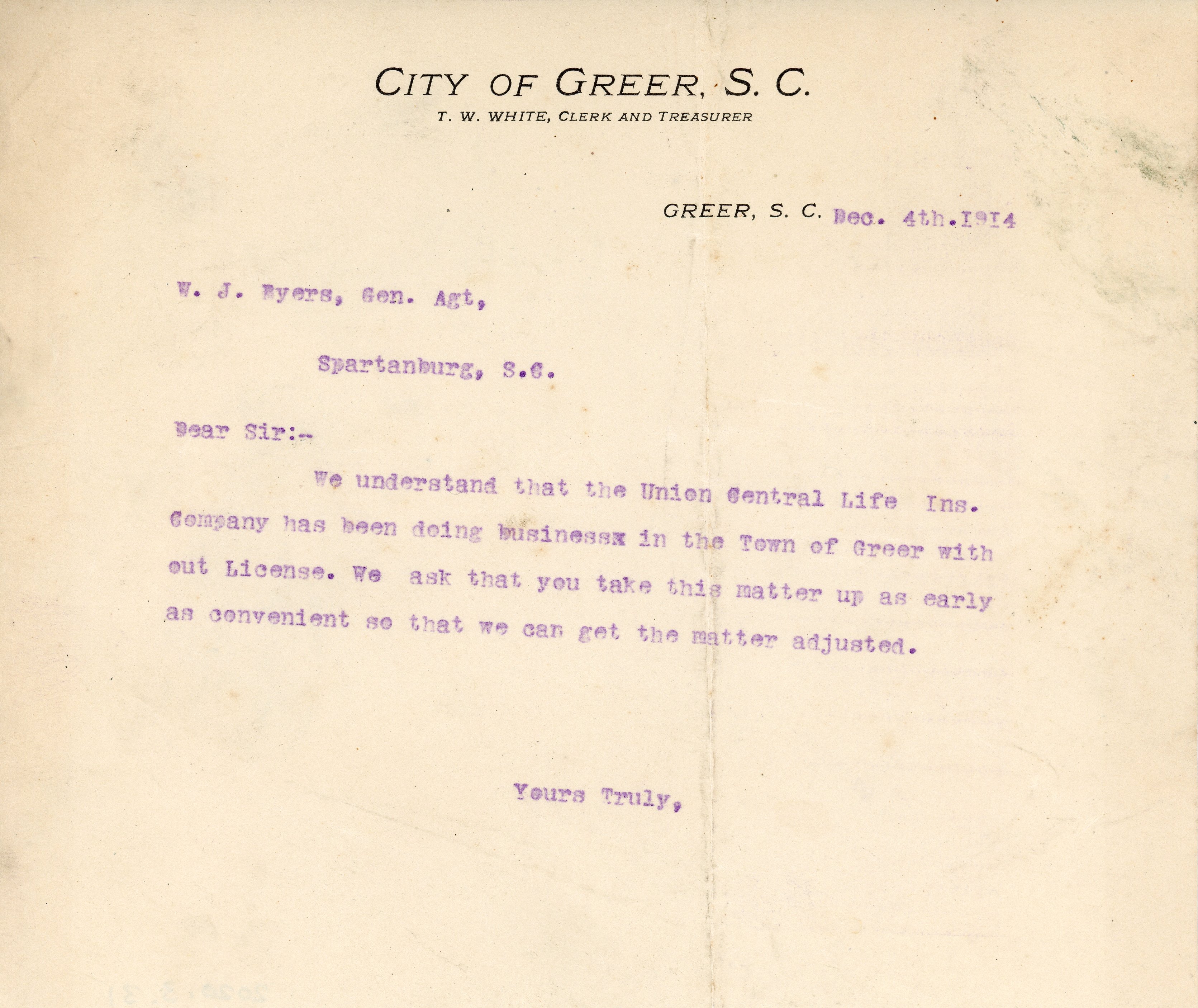 Letter 4 December 1914 T. W. White to W. J. Byers