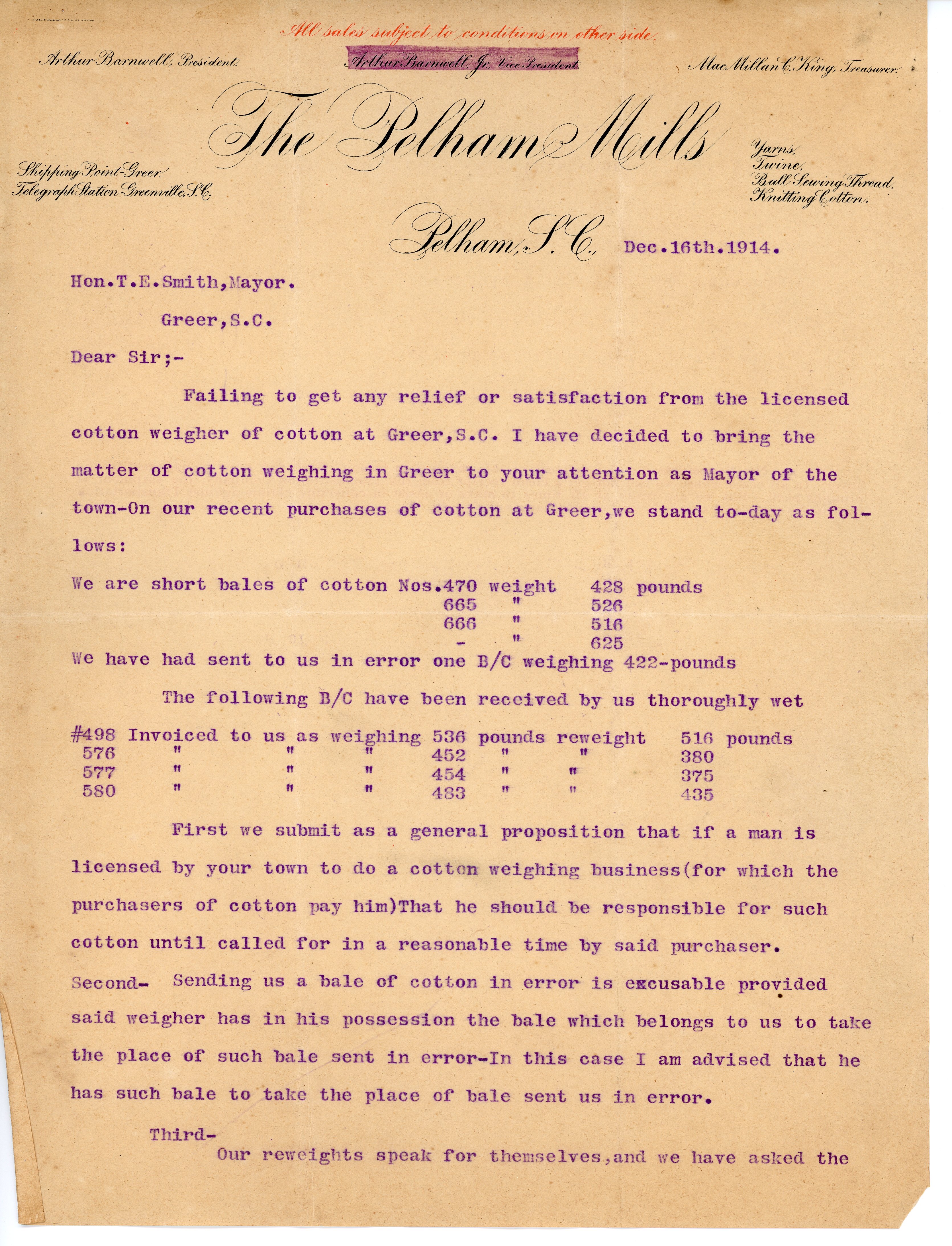 matter of cotton weighing in Greer to your attention as Mayor of the