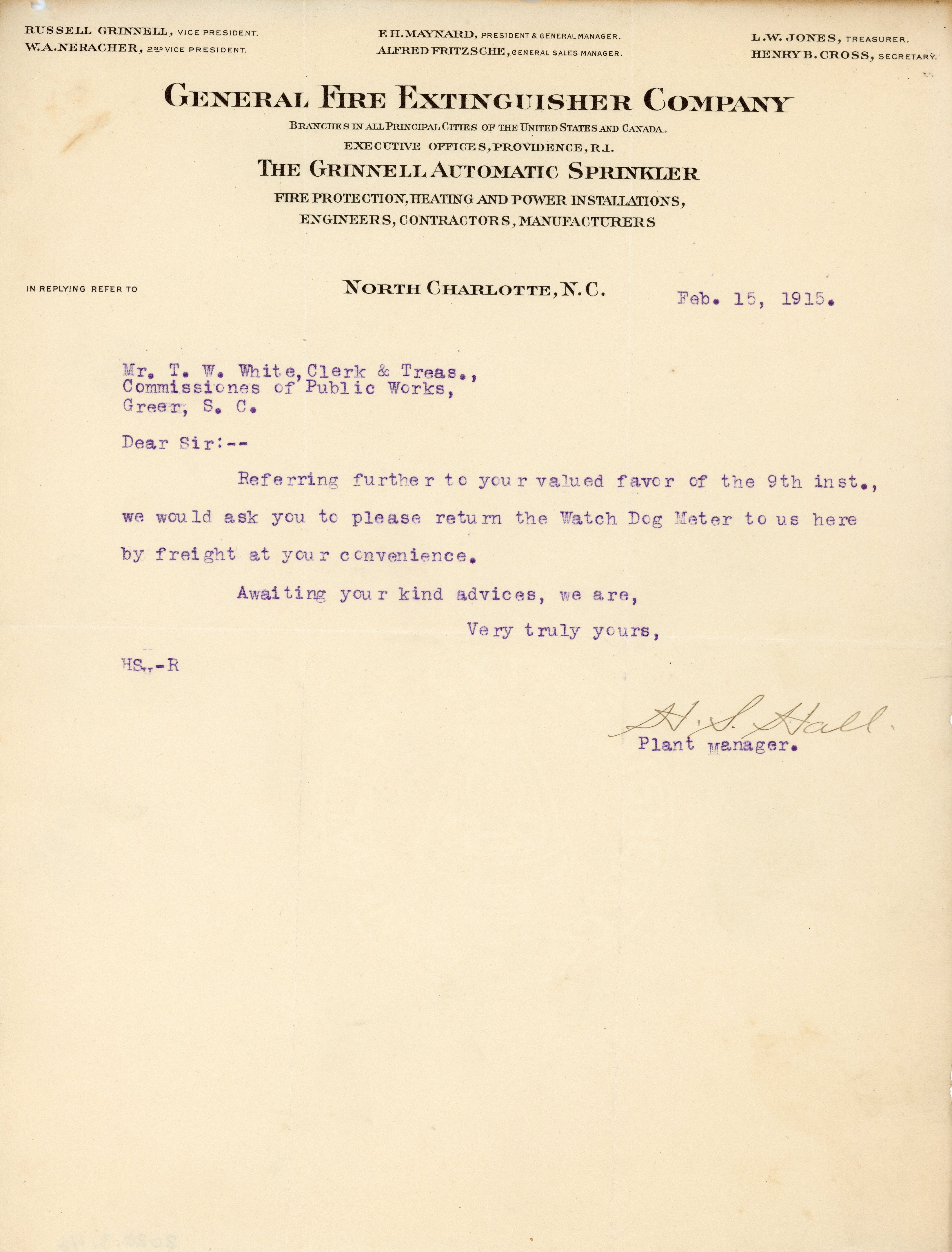Letter 15 February 1915 H. S. Hall to T. W. White
