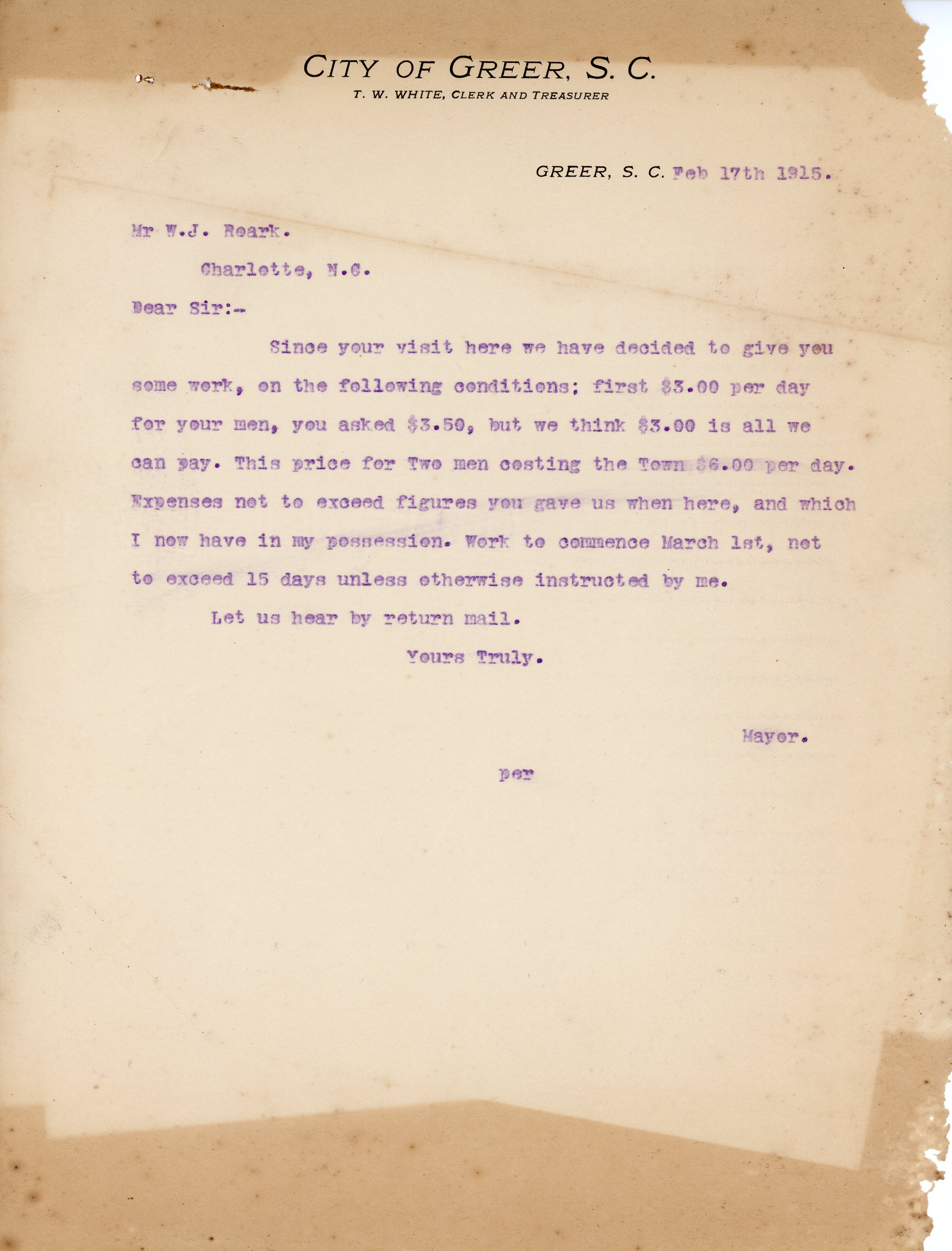 Letter 17 February 1915 T. E. Smith to W. J. Roark