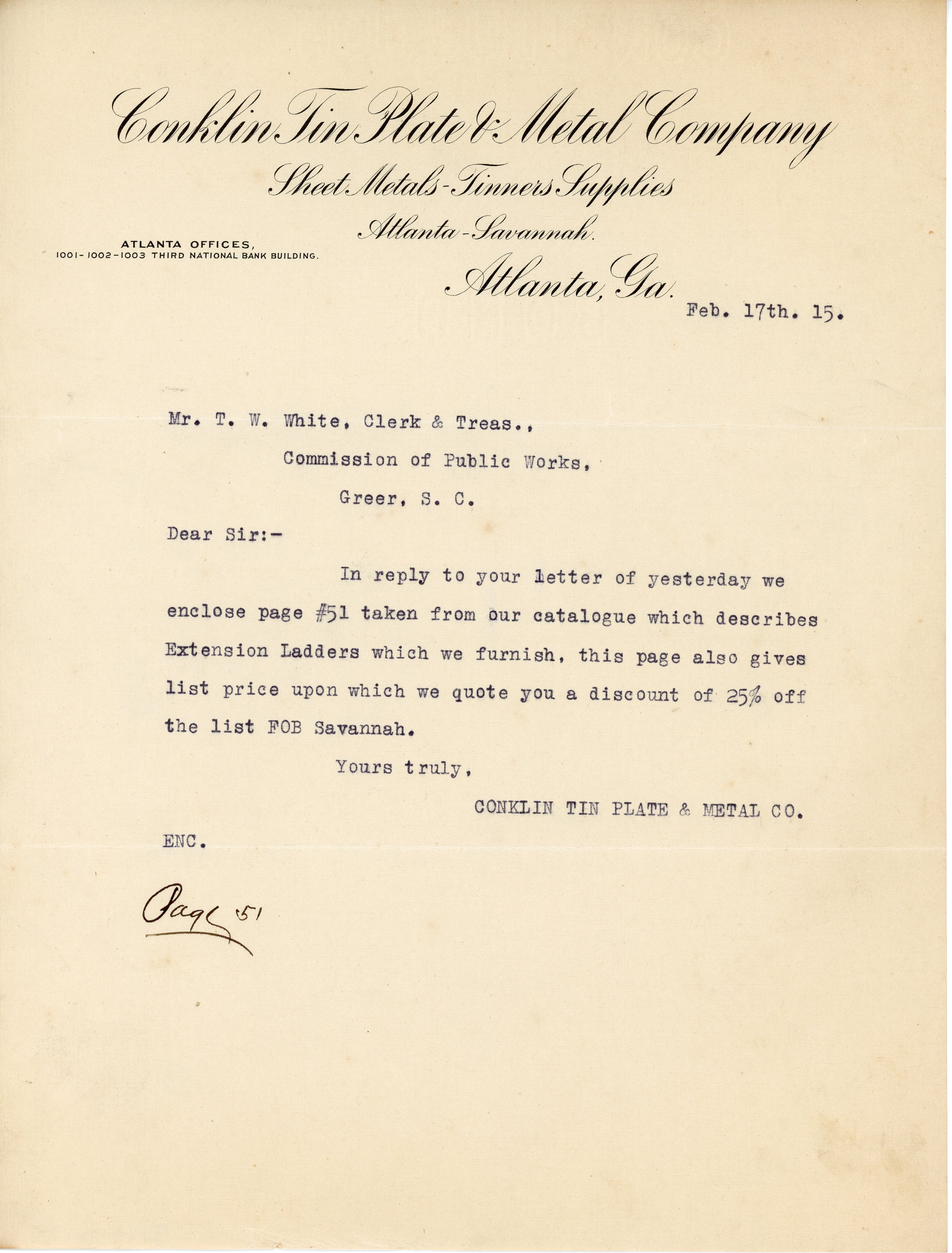 Letter 17 February 1915 Conklin Tin Plate & Metal Co. to T. W. White