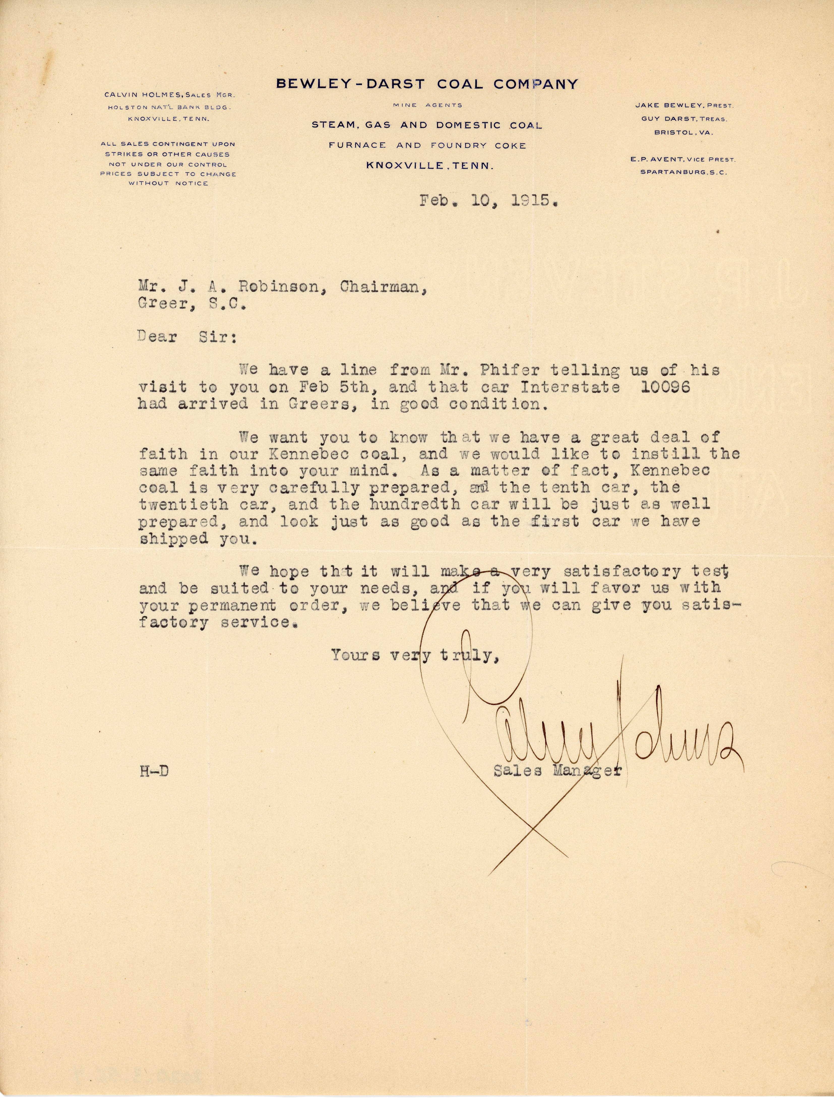 Letter 10 February 1915 Calvin Holmes to J.A. Robinson