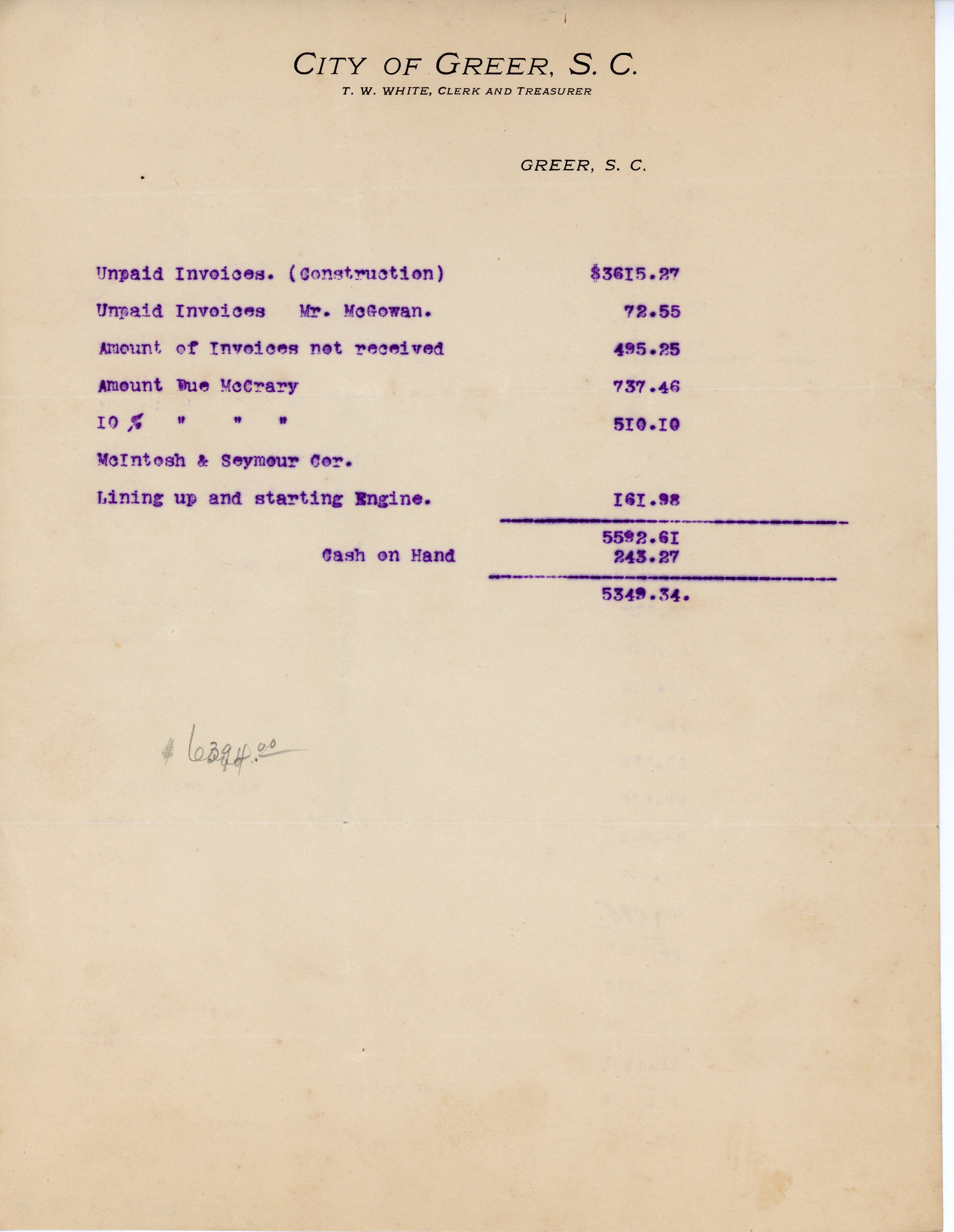 Invoice City of Greer T. W. White