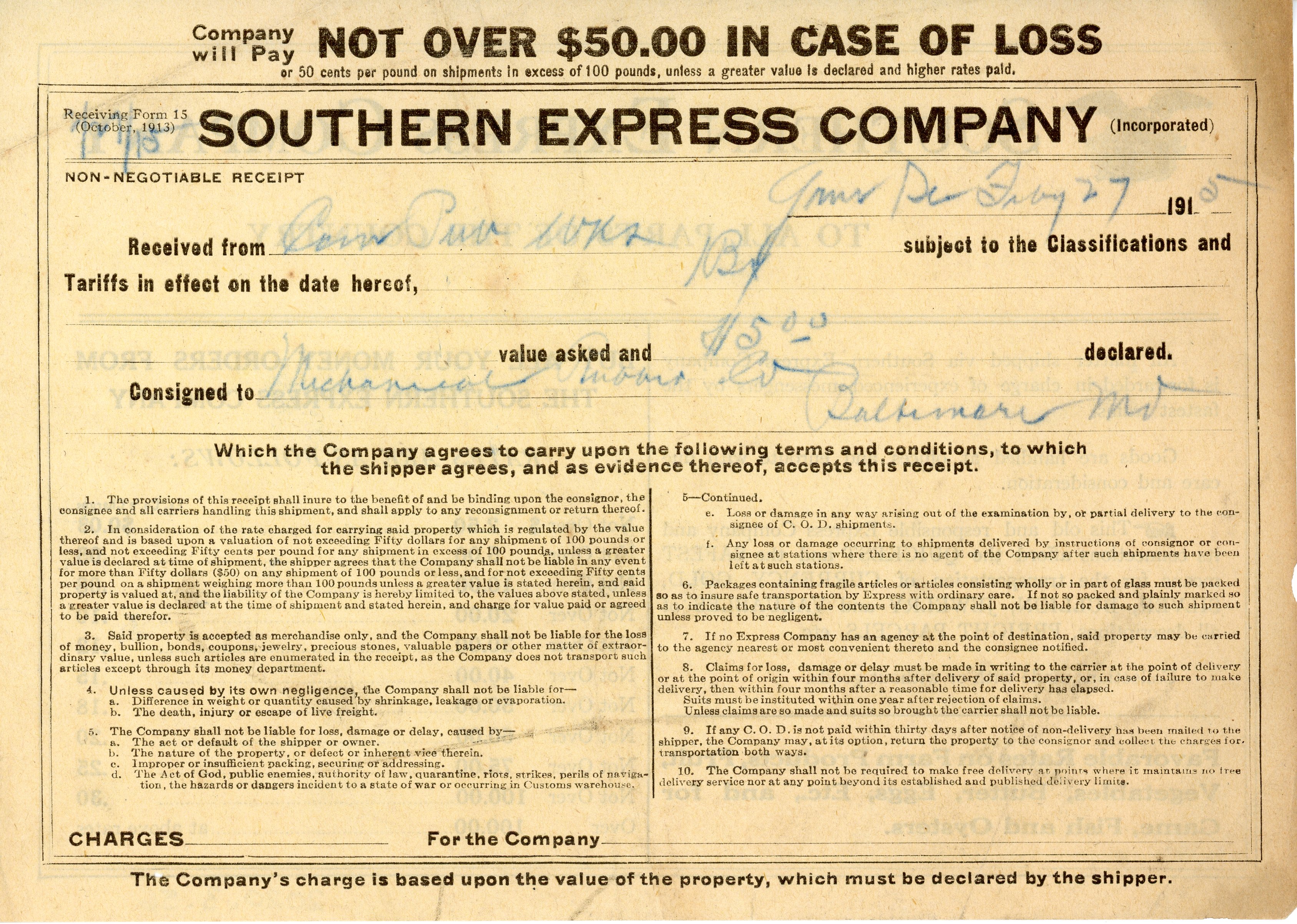 Part of Receipt 27 February 1915 Greer Public Works? [illegible] to [illegible] Baltimore Maryland