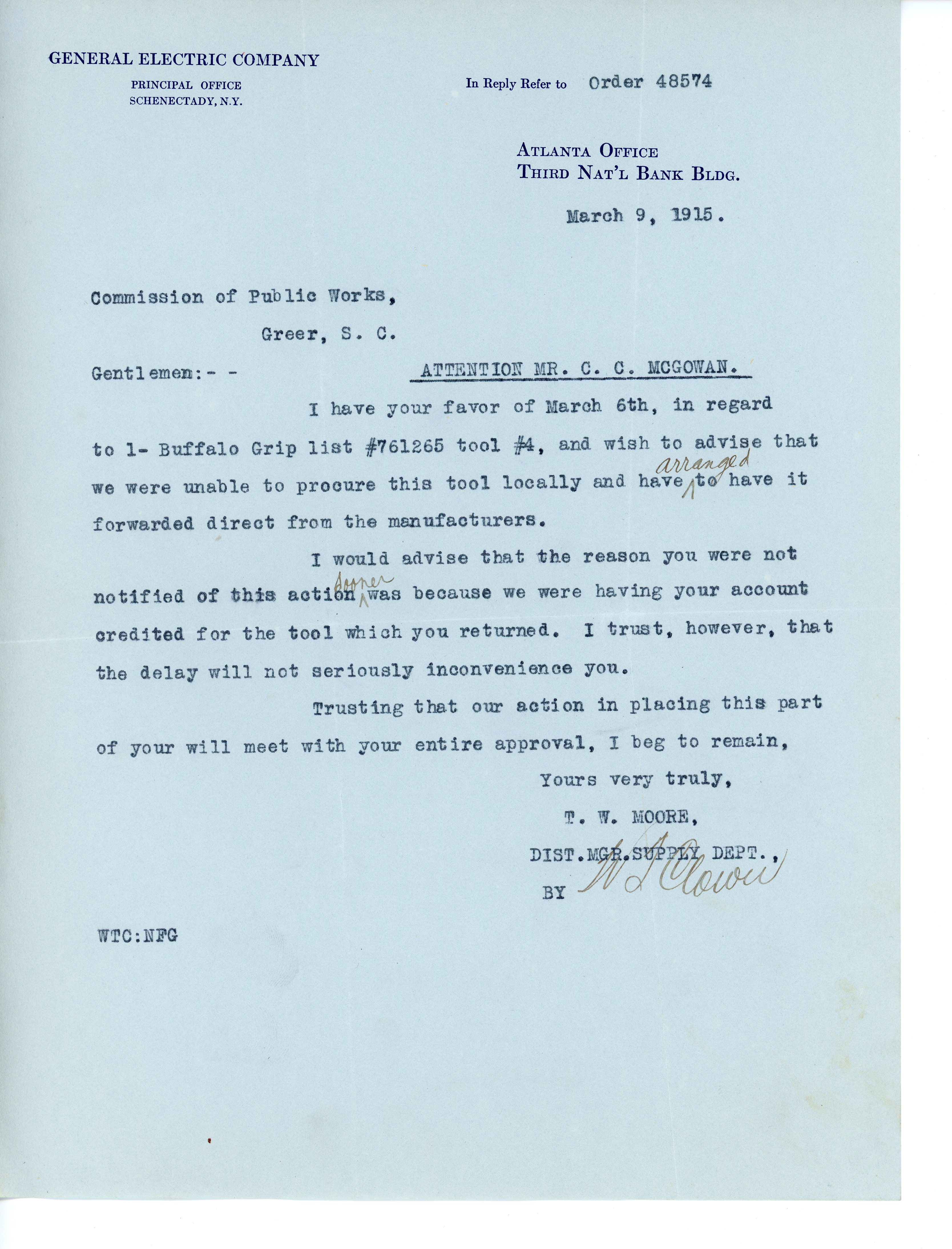 Letter 9 March 1915 T. W. Moore to J. A. Robinson and C. C. McGowan