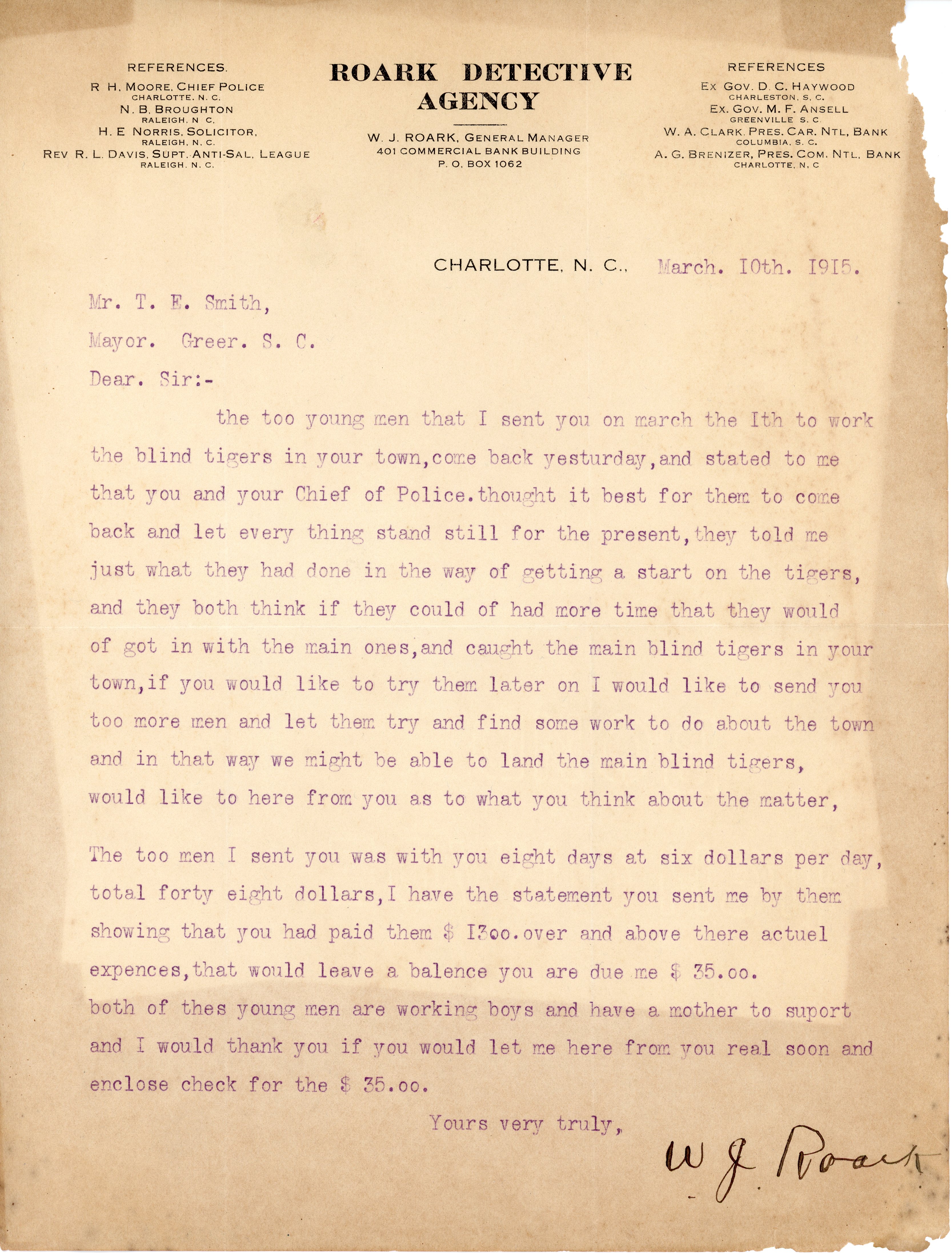 Letter 10 March 1915 W. J. Roark to T. E. Smith