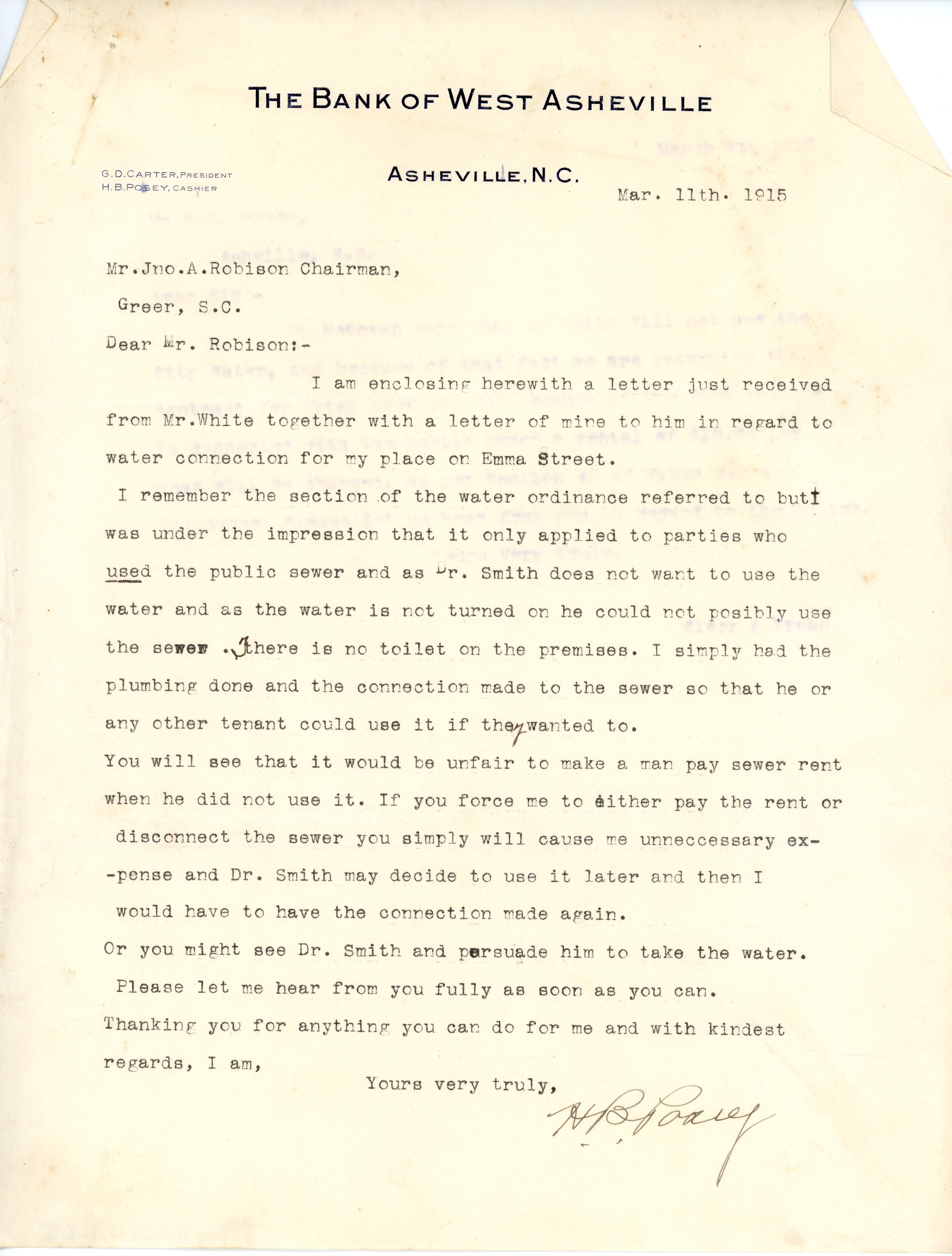Letter 11 March 1915 H. B. Posey to J. A. Robinson