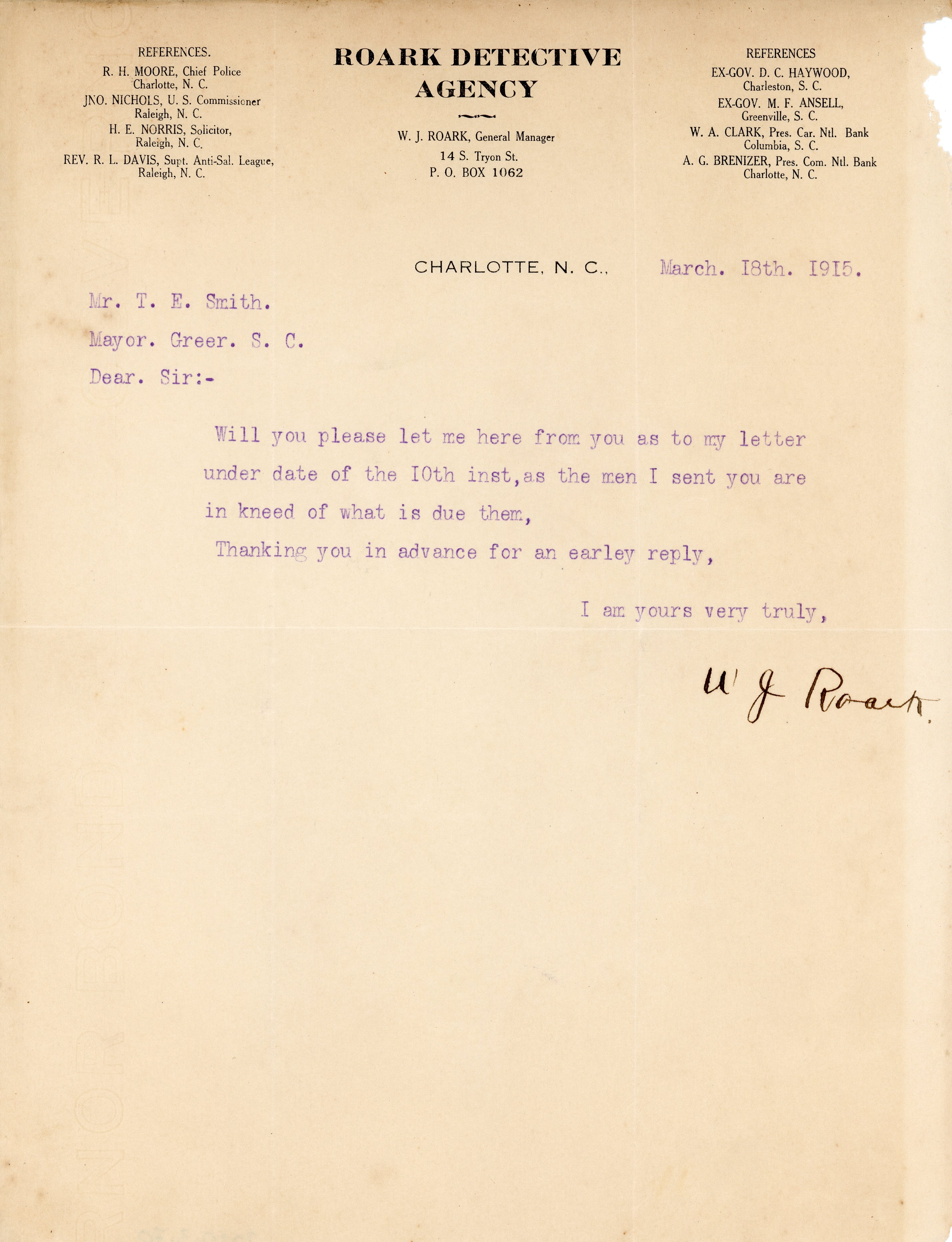 - Letter 18 March 1915 W. J. Roark to T. E. Smith