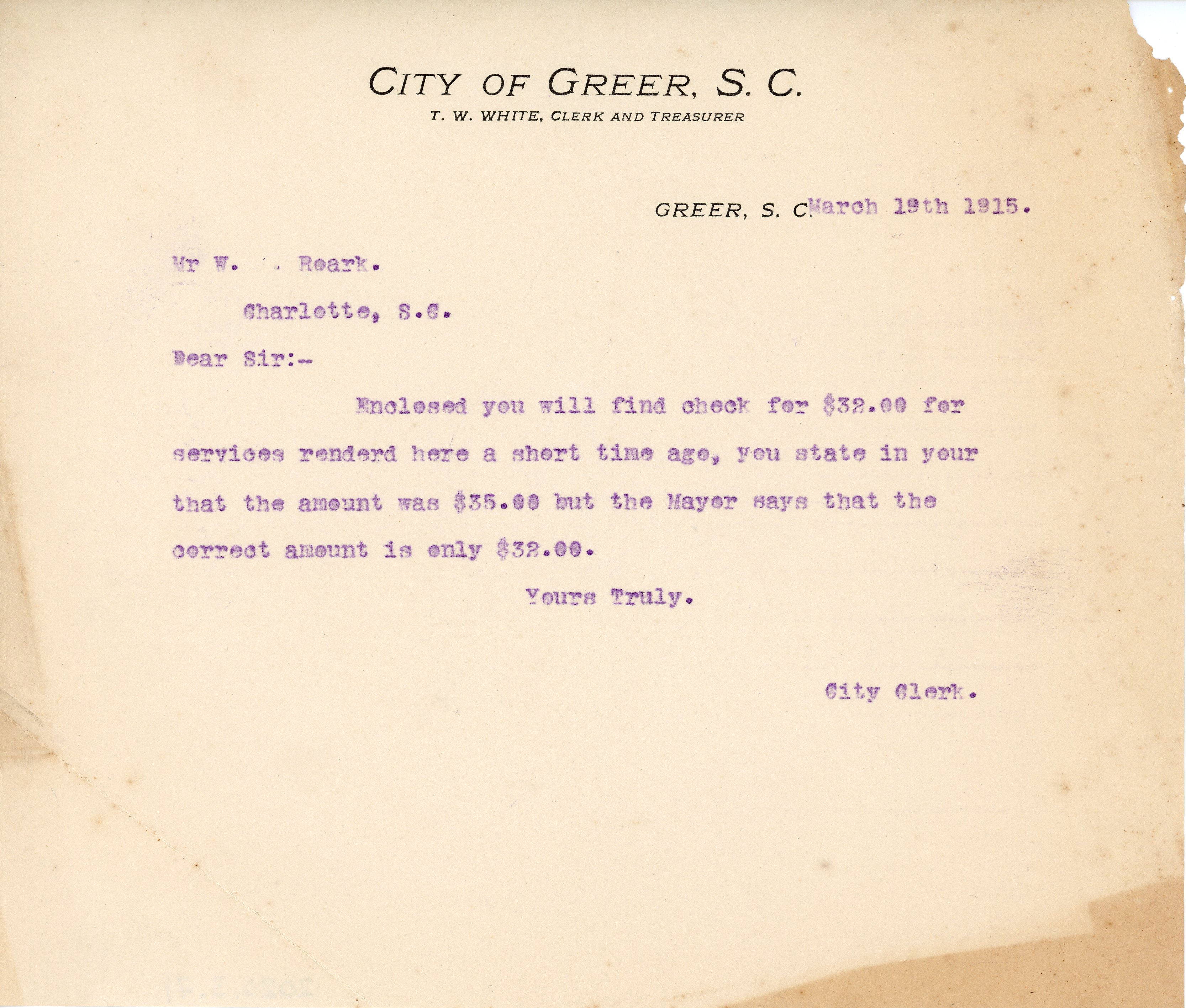 Letter 19 March 1915 T. W. White to W. J. Roark