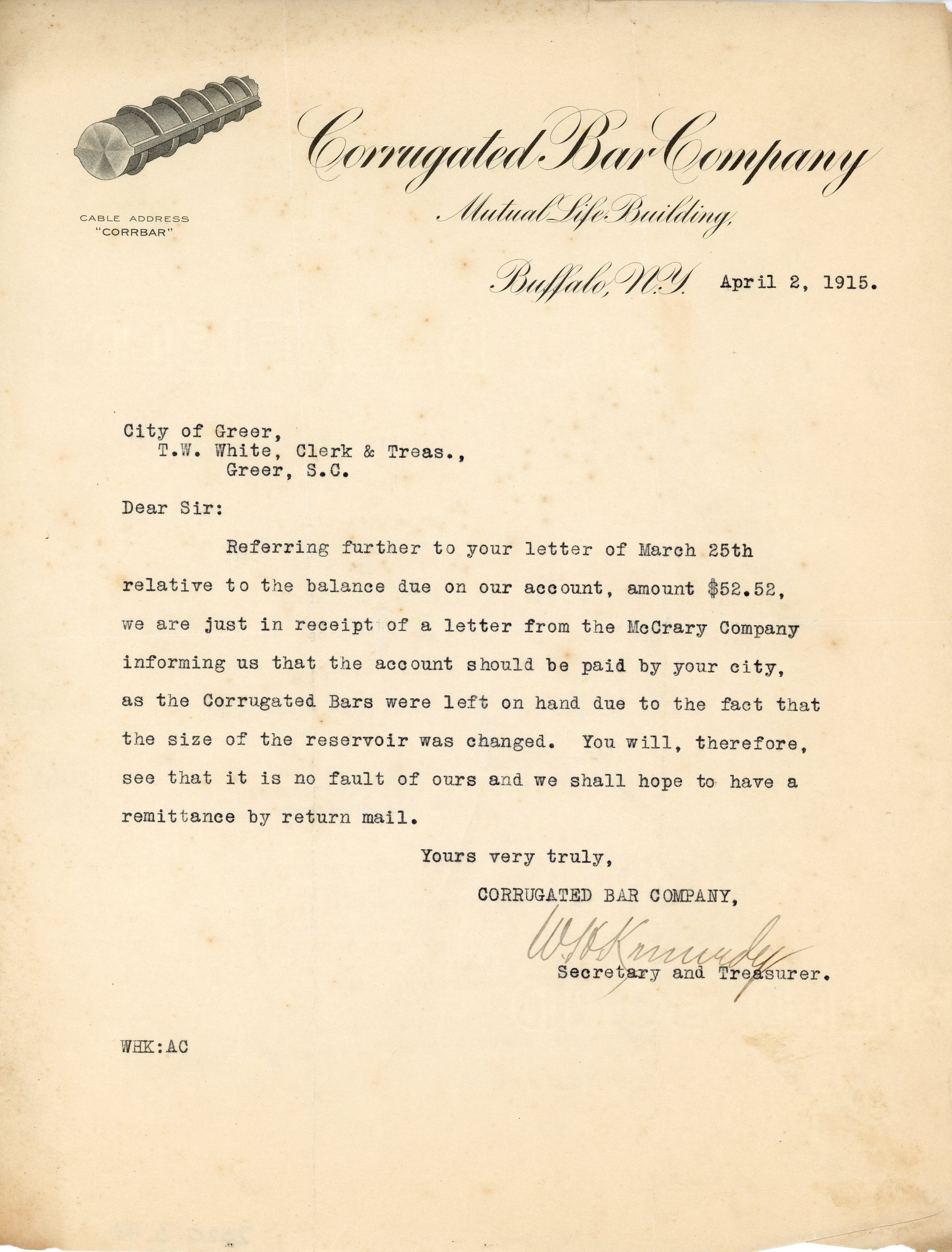 Letter 2 April 1915 W. H. Kennedy to T. W. White