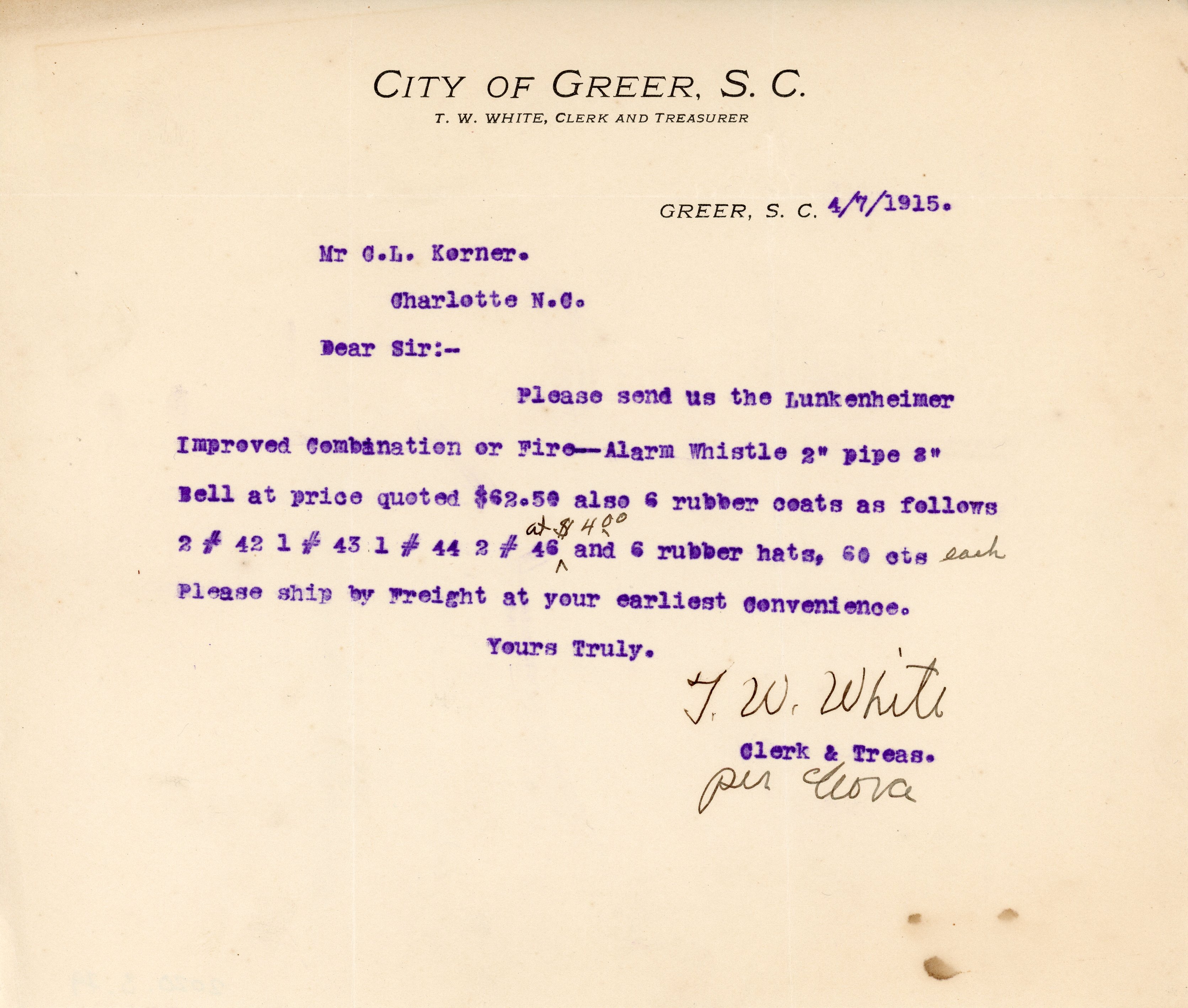 Letter 7 April 1915 T. W. White to G. L. Kerner