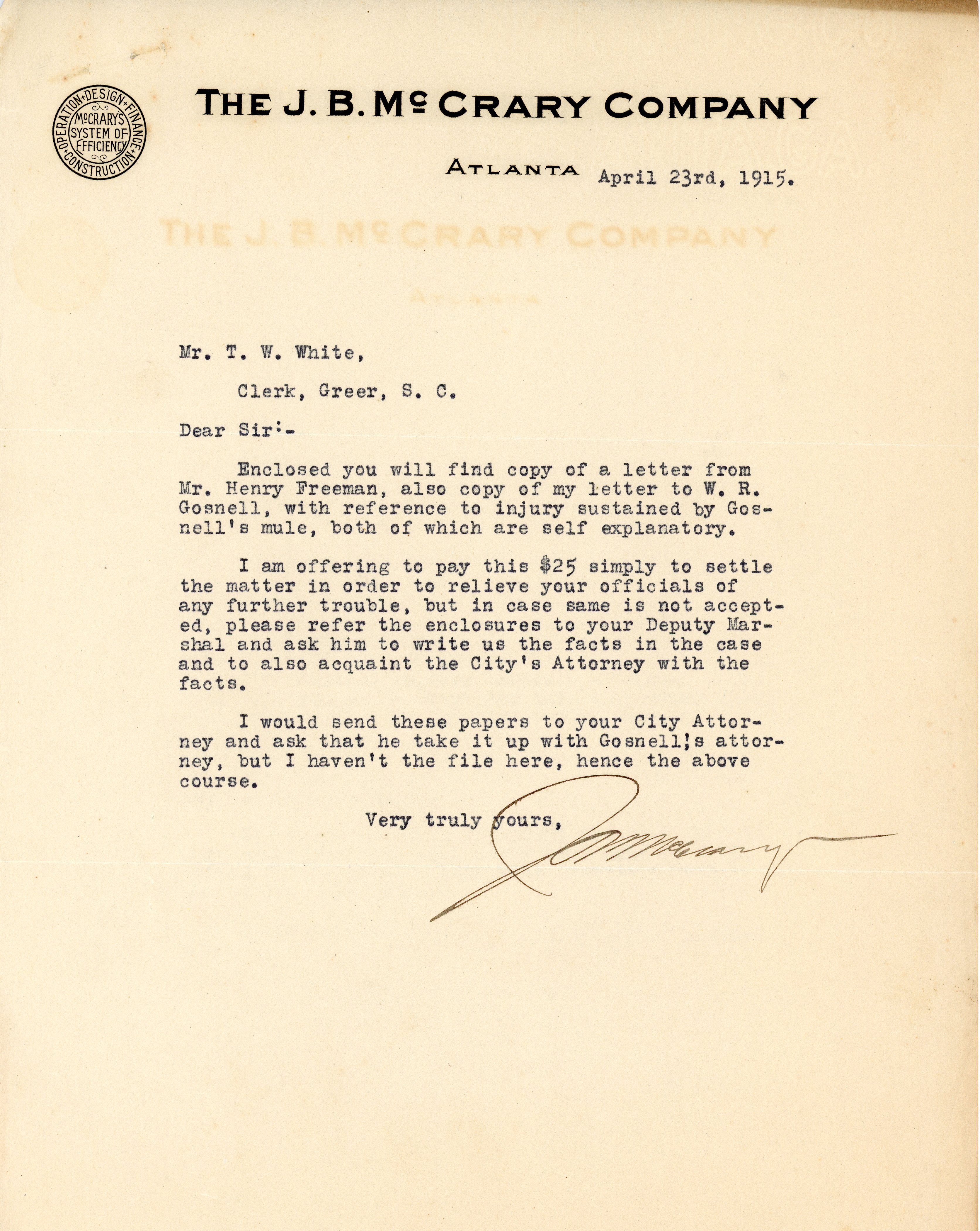 - Letter 23 April 1915 J. B. McCrary to T. W. White