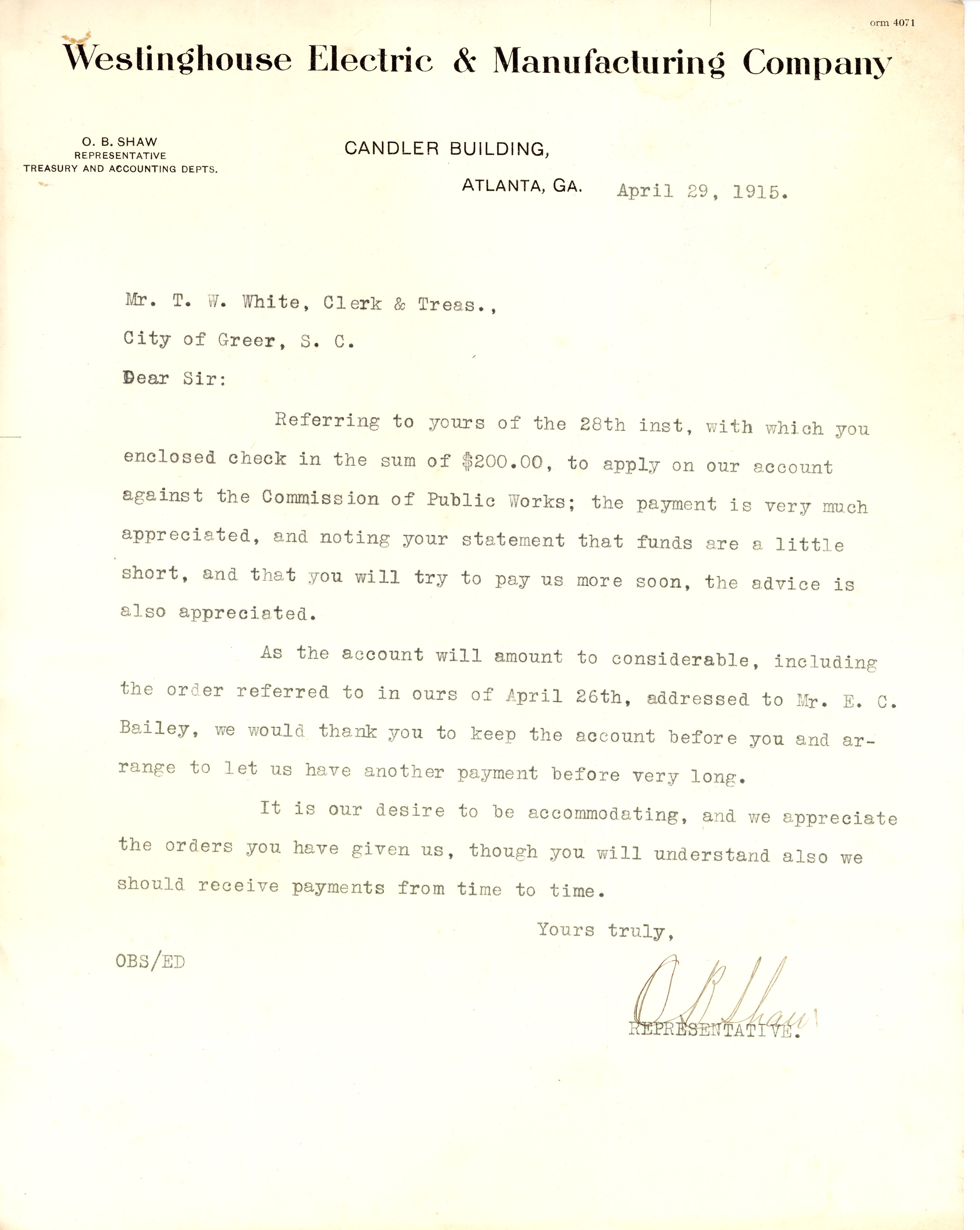Letter 29 April 1915 O. B. Shaw to T. W. White