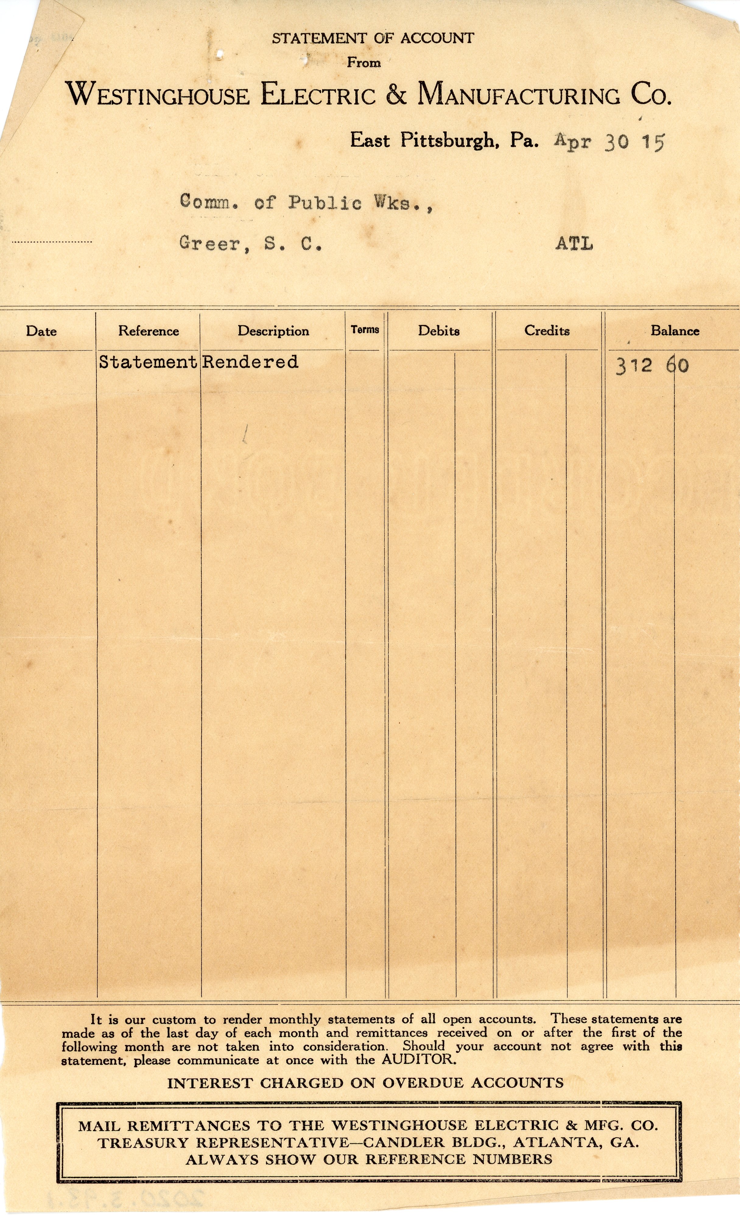 Part of Receipt 30 April 1915 Westinghouse Electric & Manufacturing Co. to Commission of Public Works Greer, SC