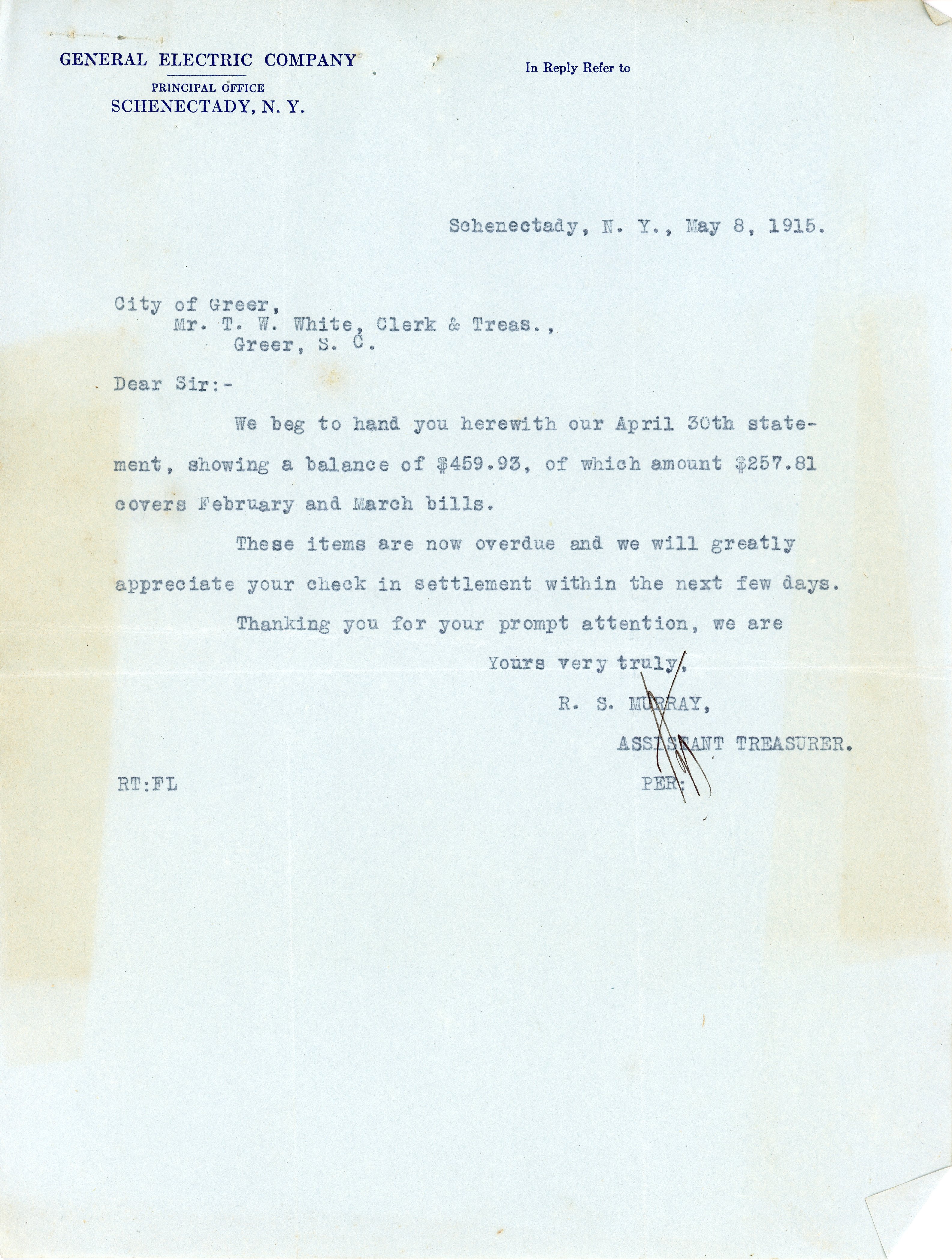 Letter 8 May 1915 General Electric Co. to T. W. White
