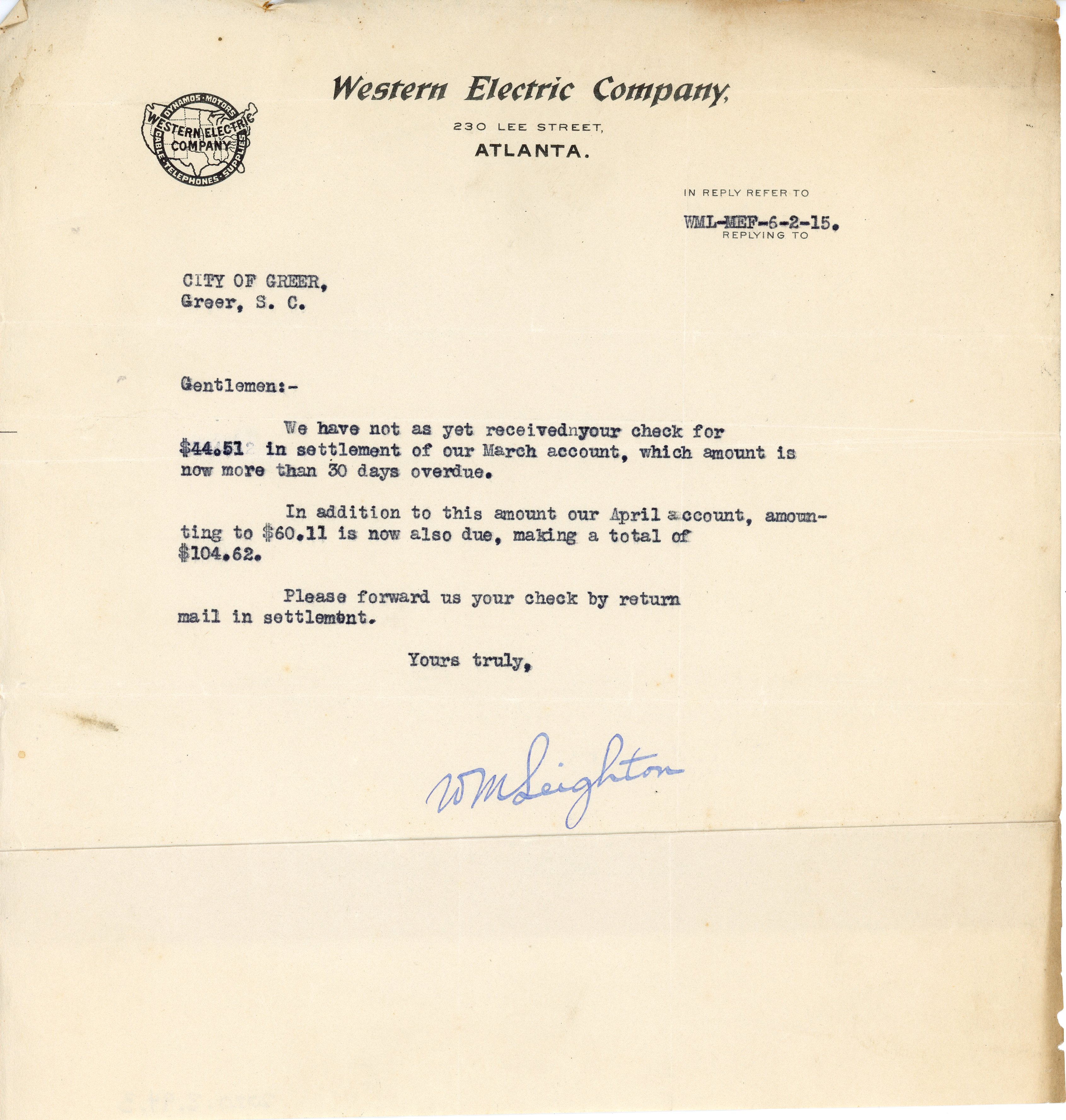 Letter 2 June 1915 W. M. Leighton to City of Greer