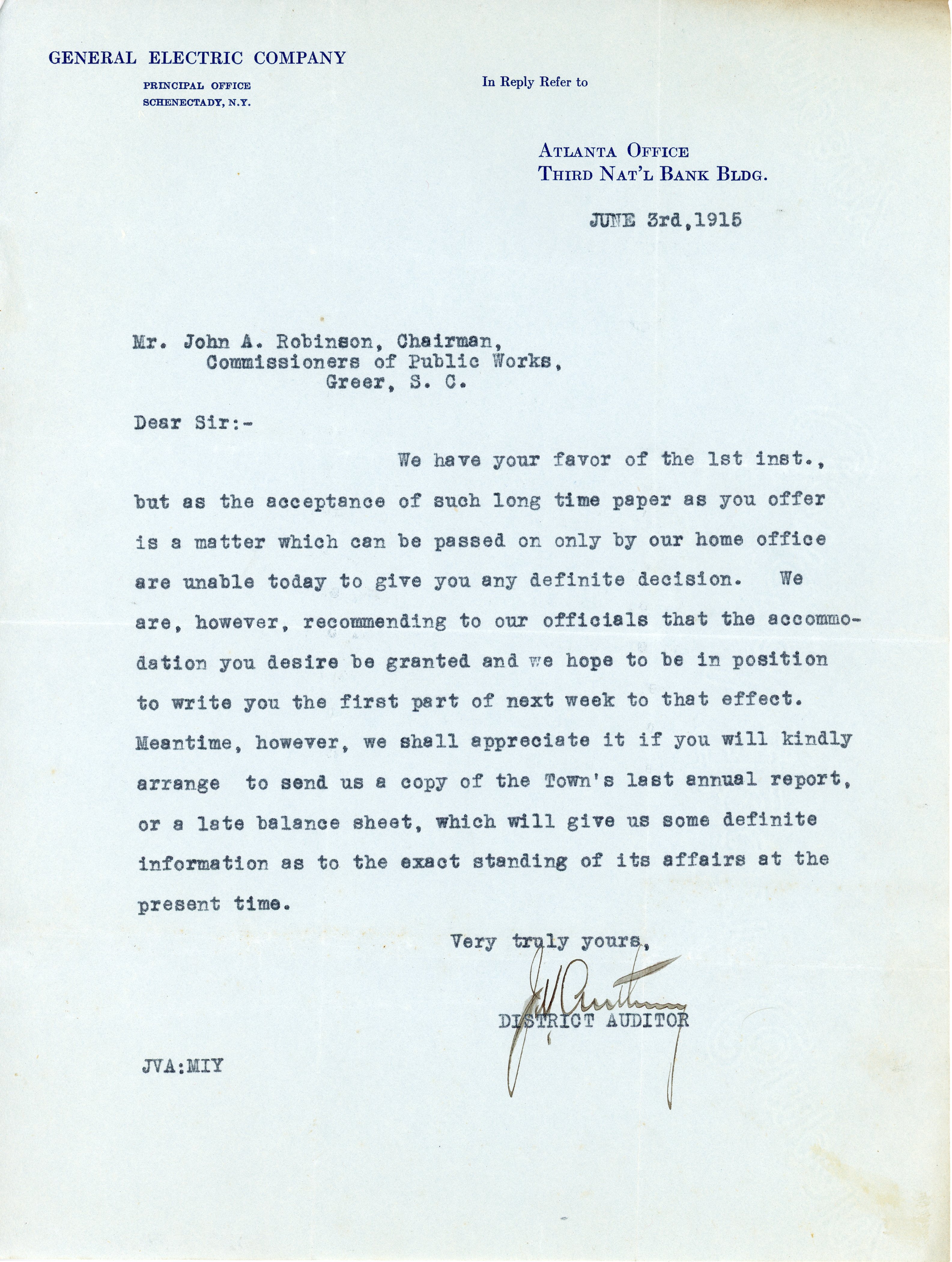 Letter 3 June 1915 J. V. A [illegible] to J. A. Robinson