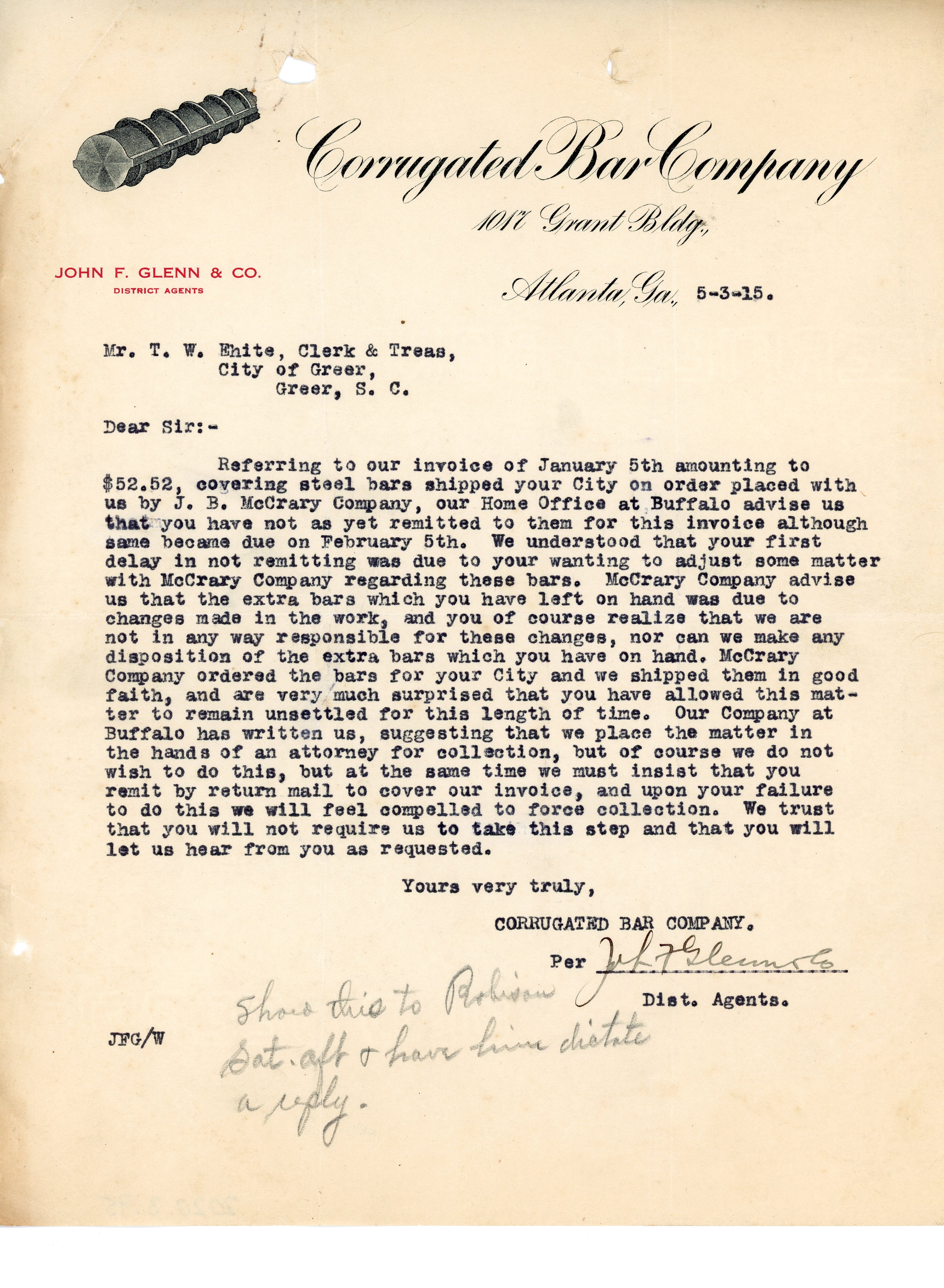 - Letter 3 May 1915 J. F. Glenn to T. W. White