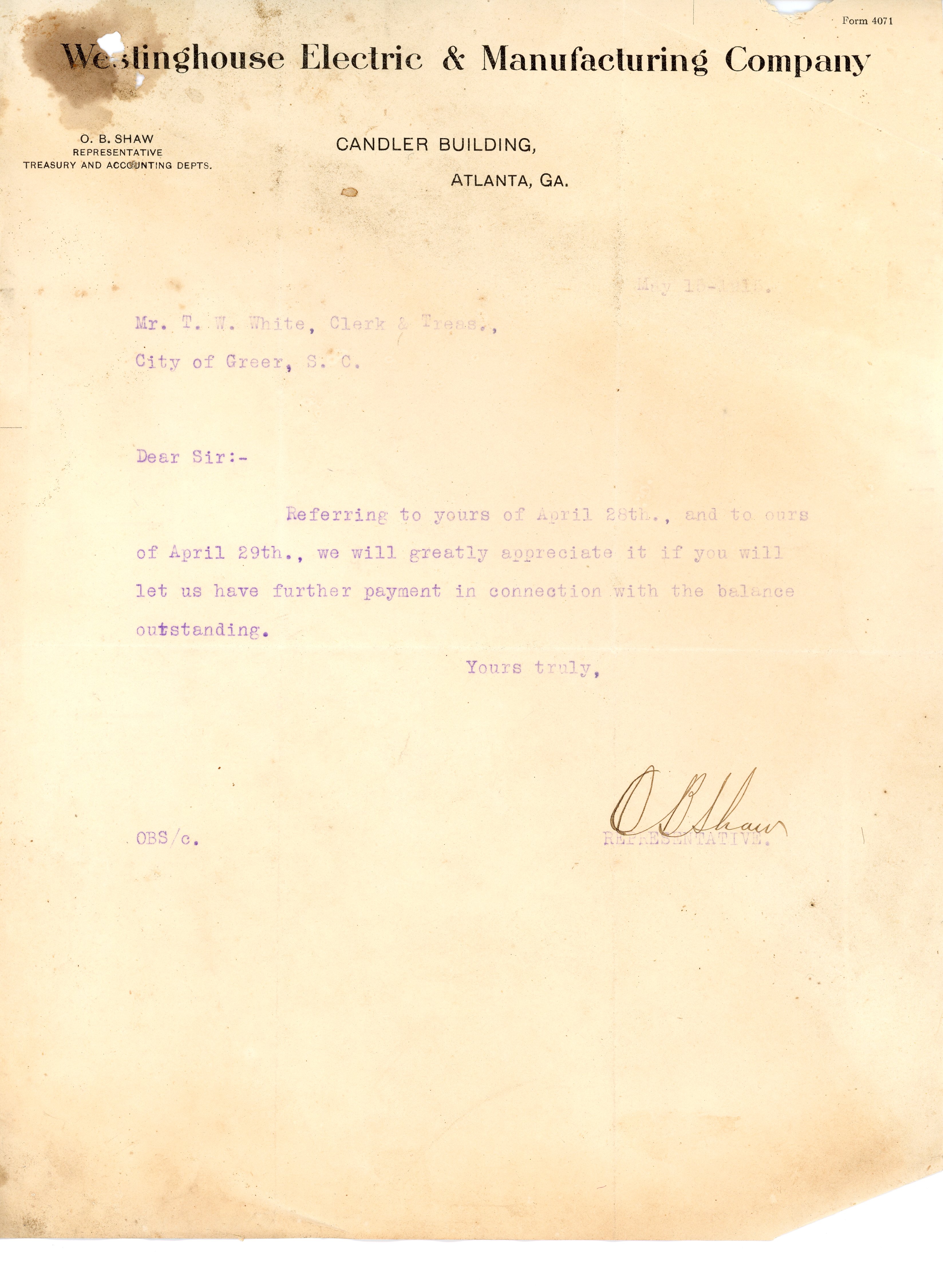 Letter 15? May 1915 O. B. Shaw to T. W. White