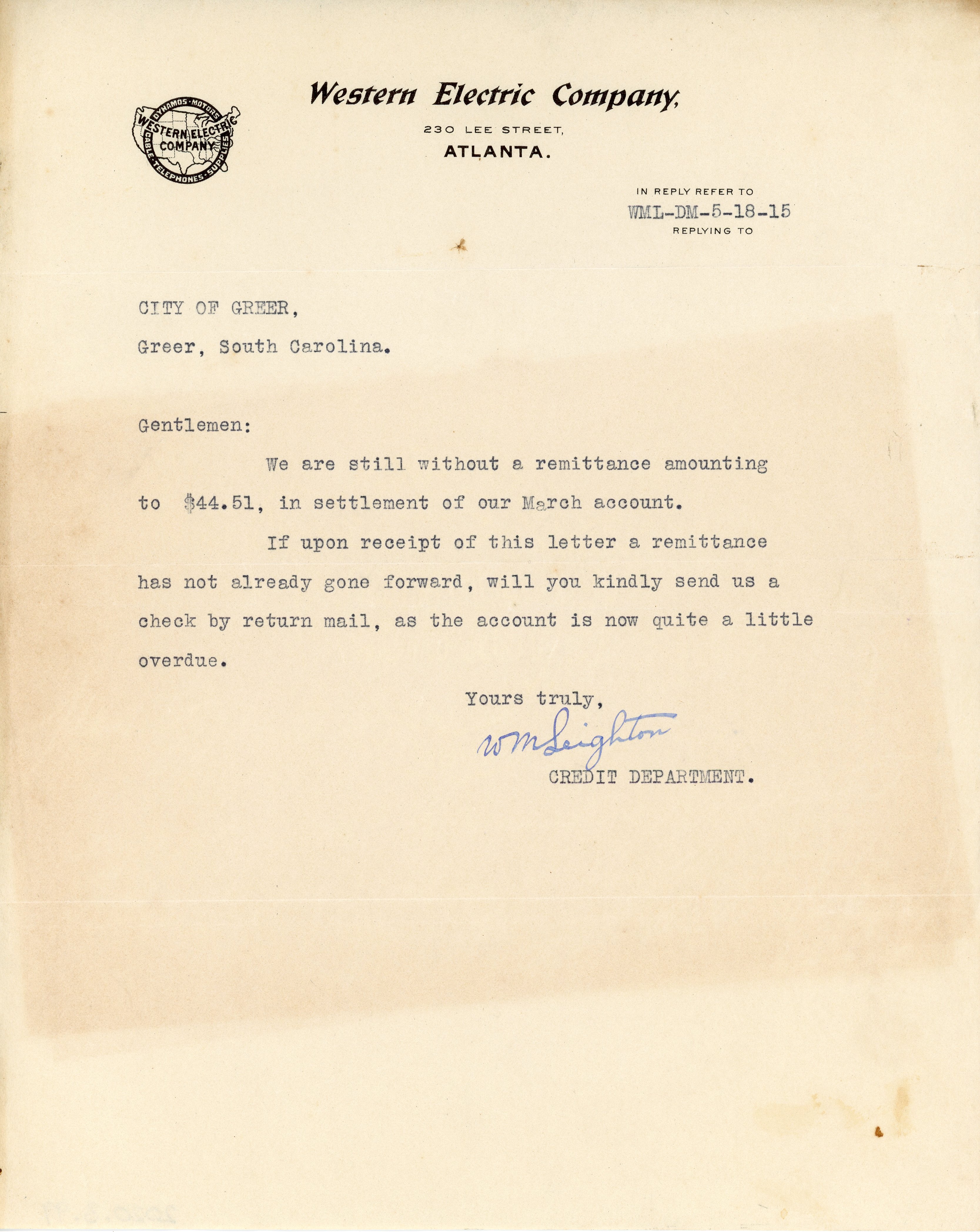 Letter 18 May 1915 W. M. Leighton to City of Greer, Greer S. C.