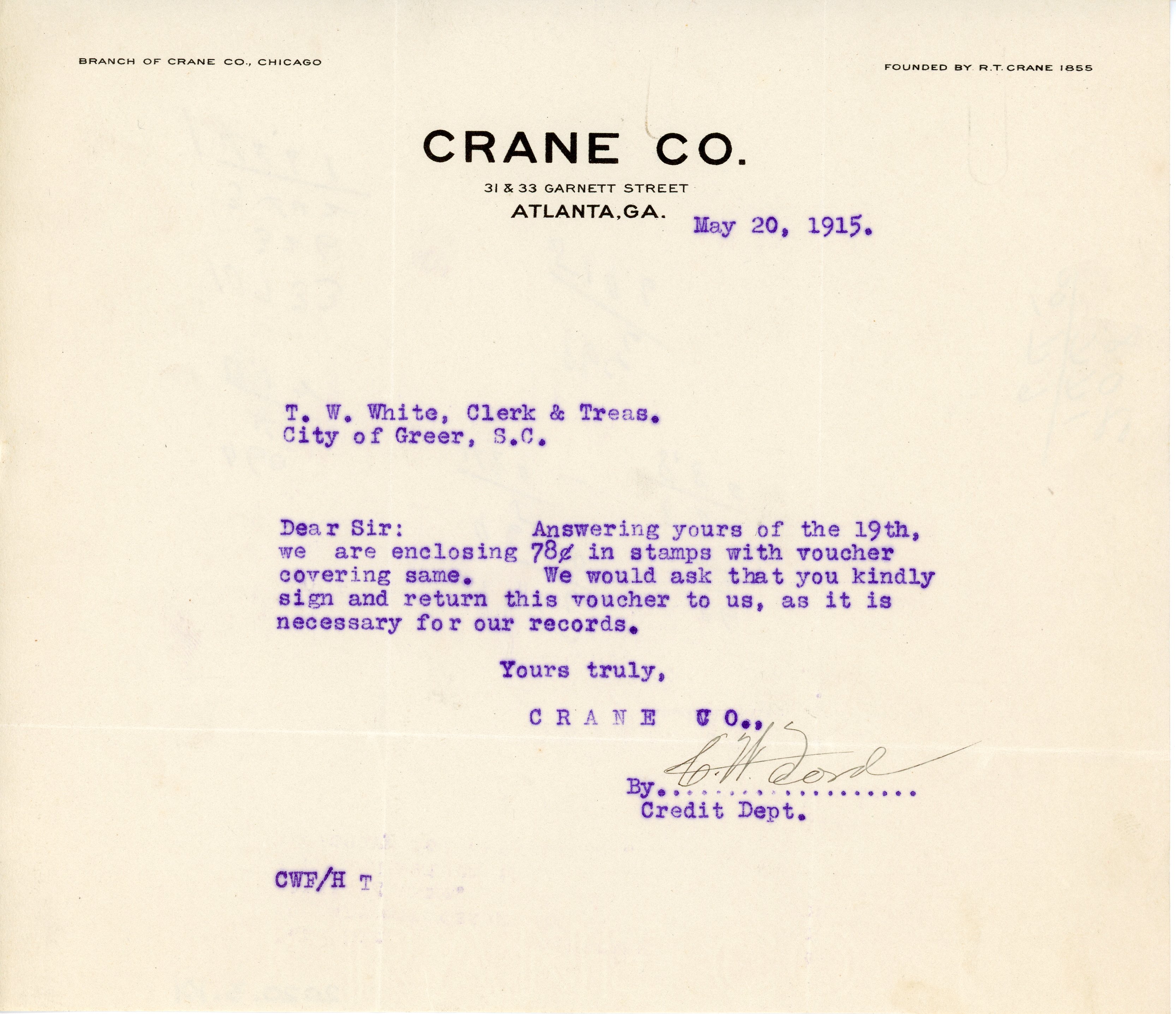 Letter 20 May 1915 C. W. Ford to T. W. White