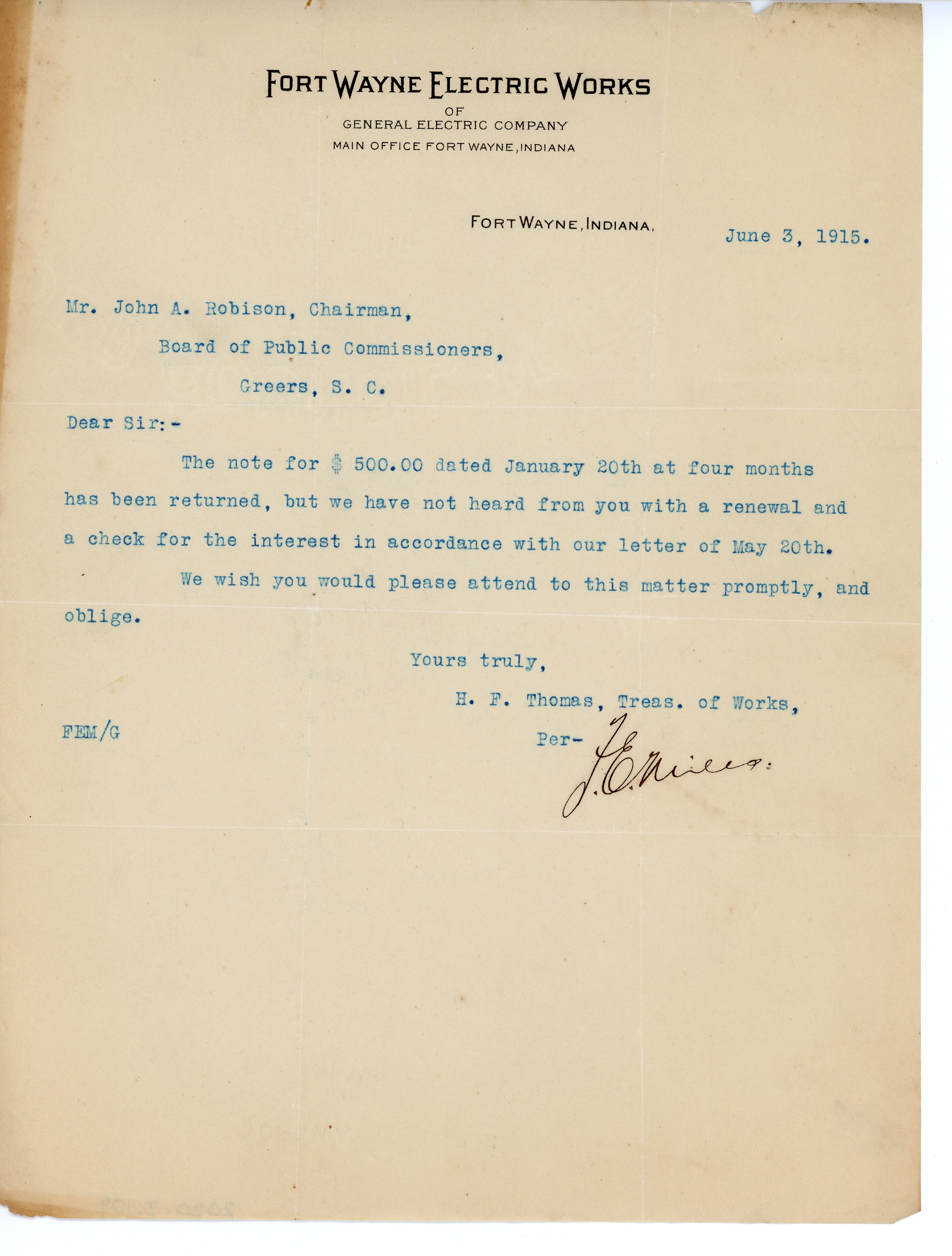Letter 3 June 1915 H. F. Thomas per F. E. M [illegible] to J. A. Robinson