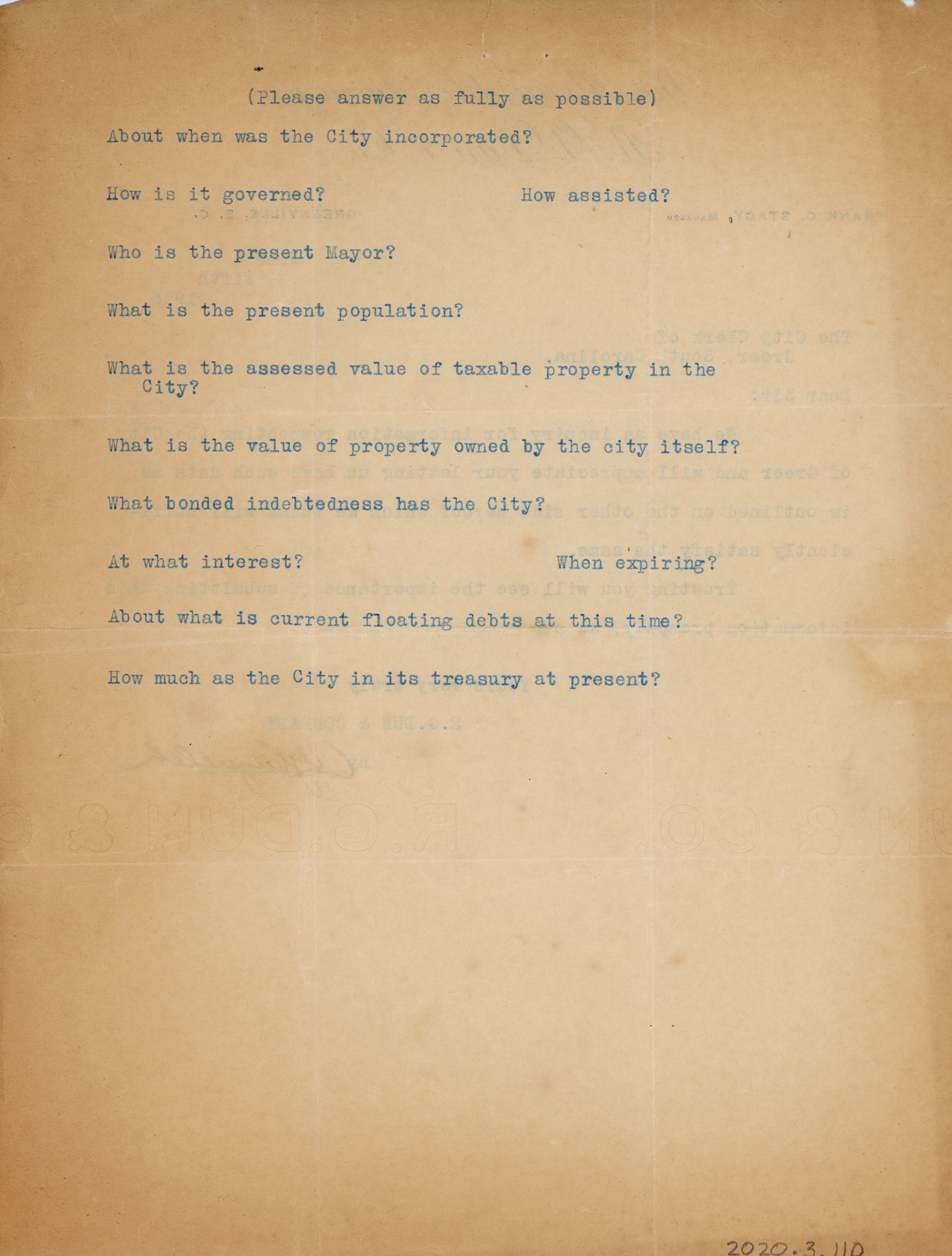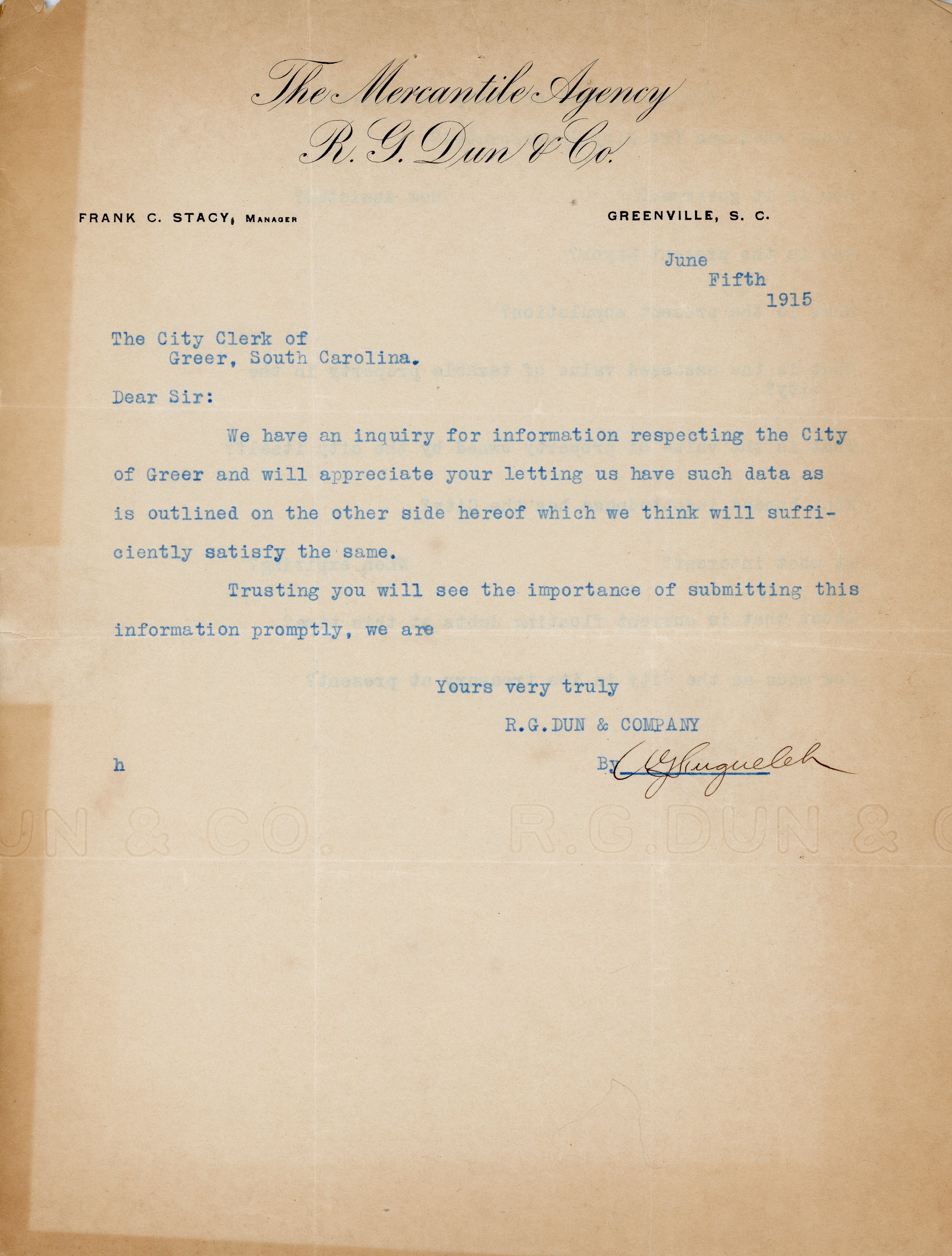 - Letter 5 June 1915 R. G. Dun & Co. by [illegible] to City Clerk of Greer, S. C.