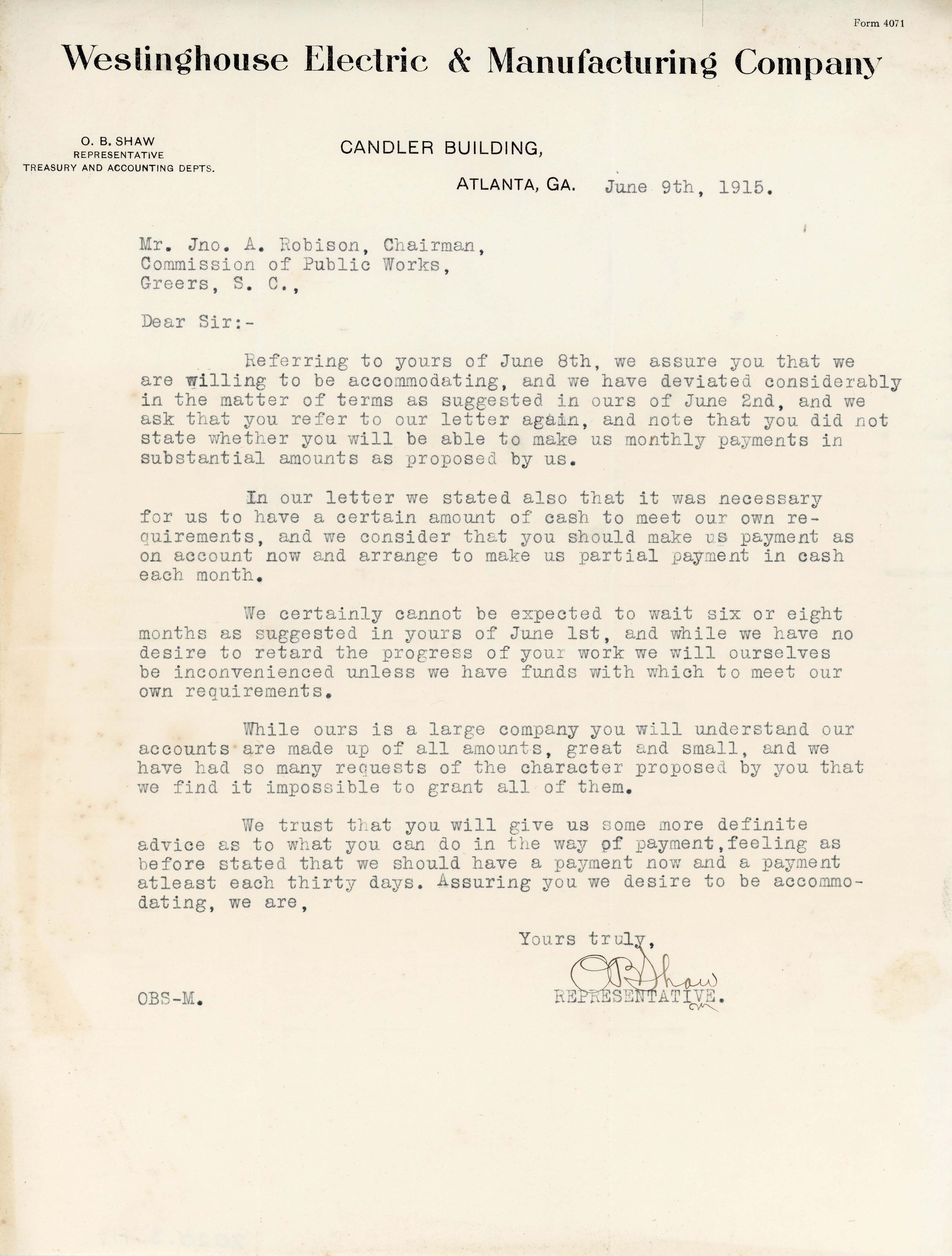 Letter 9 June 1915 O. B. Shaw to J. A. Robinson