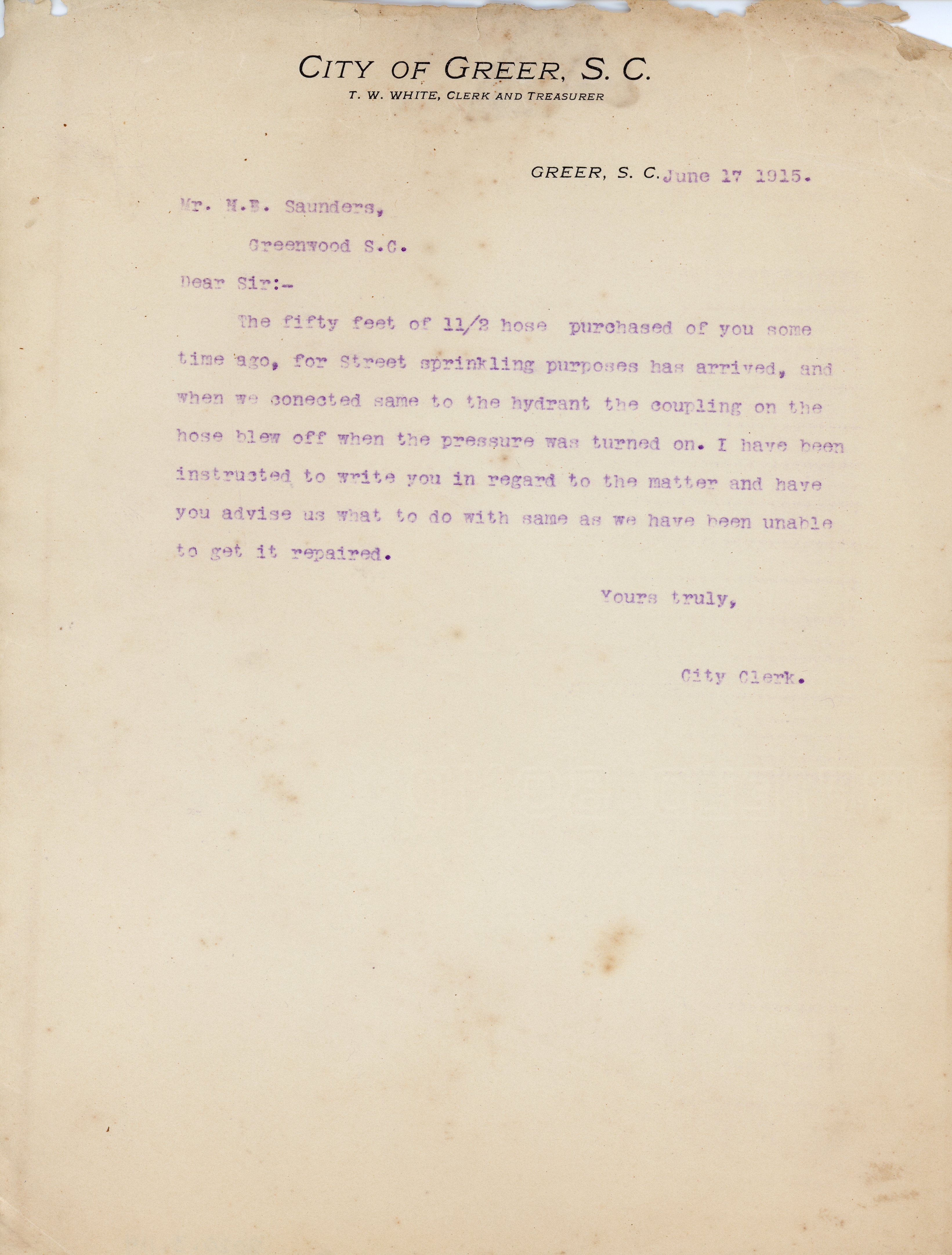 - Letter 17 June 1915 T. W. White to M. B. Saunders