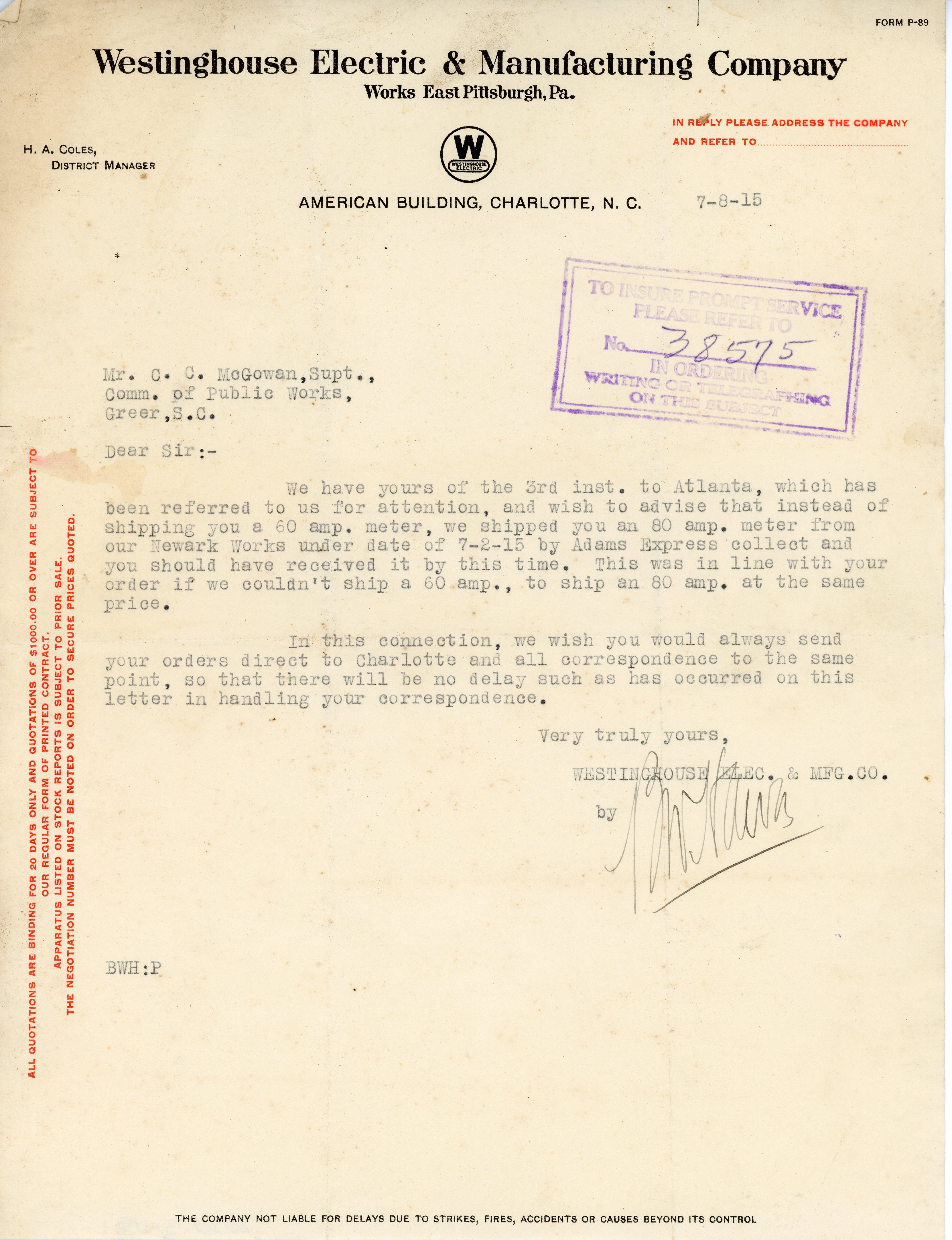 Letter 8 July 1915 B. W. H. [illegible] to C. C. McGowan