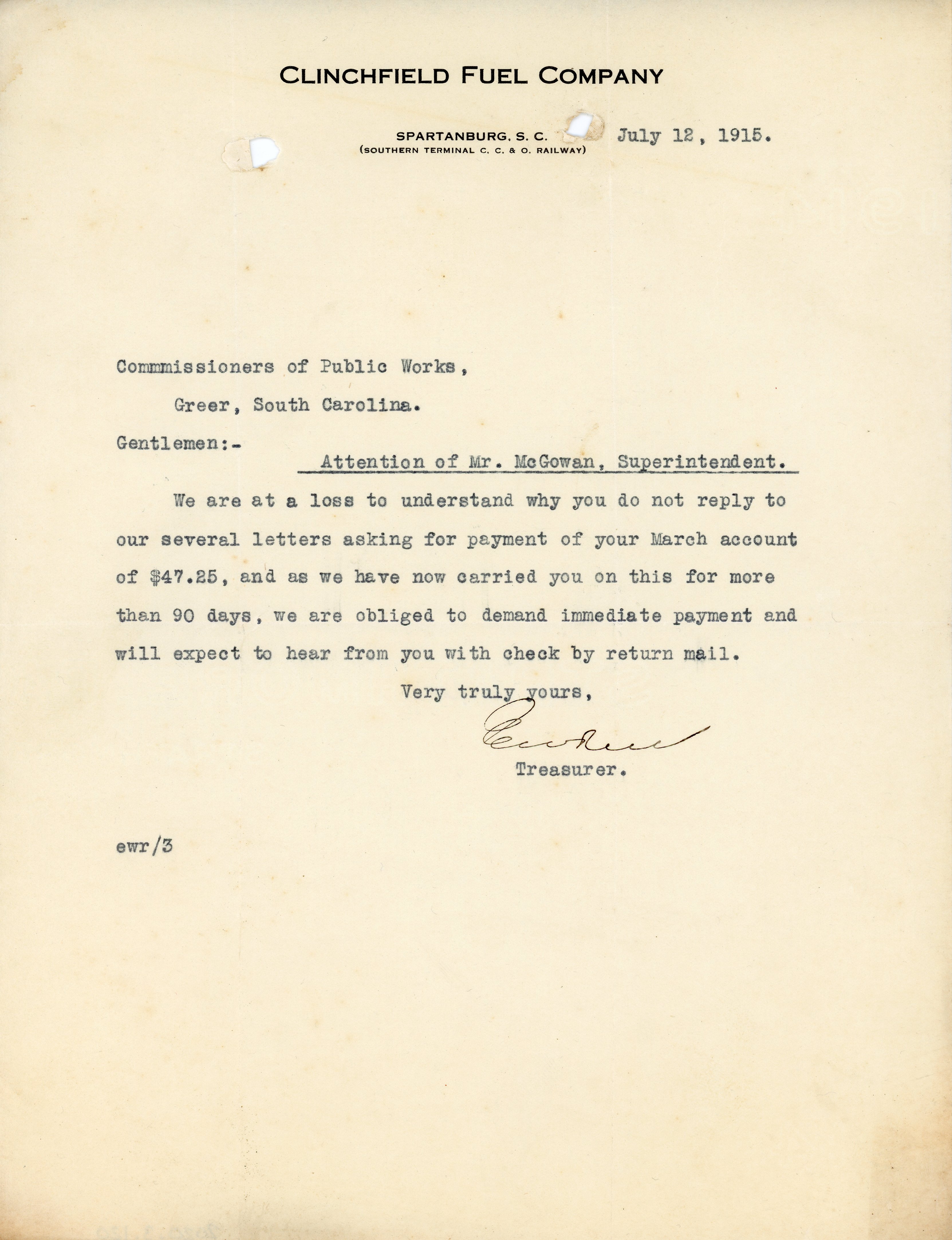 - Letter 12 July 1915 E. W. R. [illegible] to Commissioners of Public Works Greer, S.C.