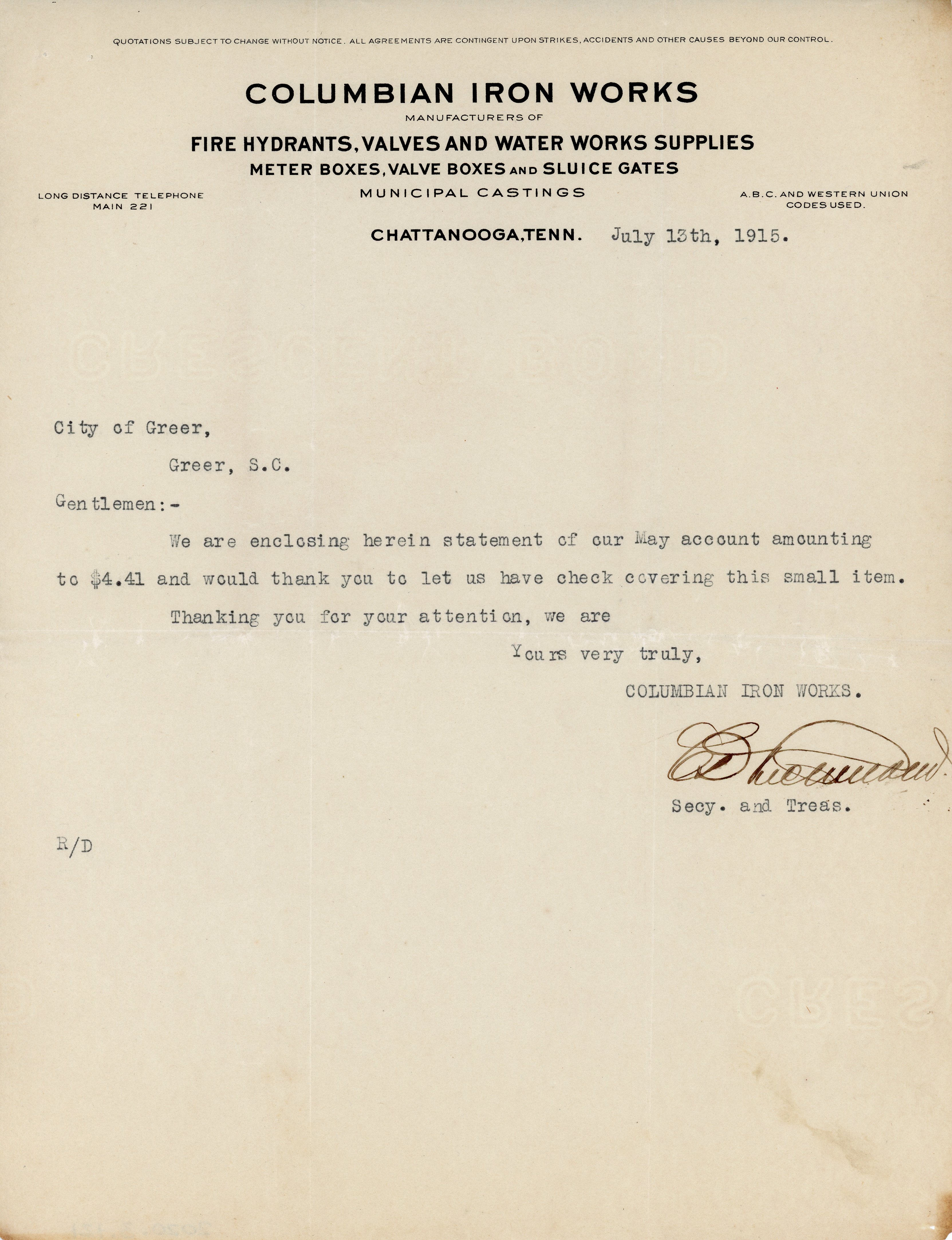 - Letter 13 July 1915 Columbian Iron Works to City of Greer, Greer, S. C.