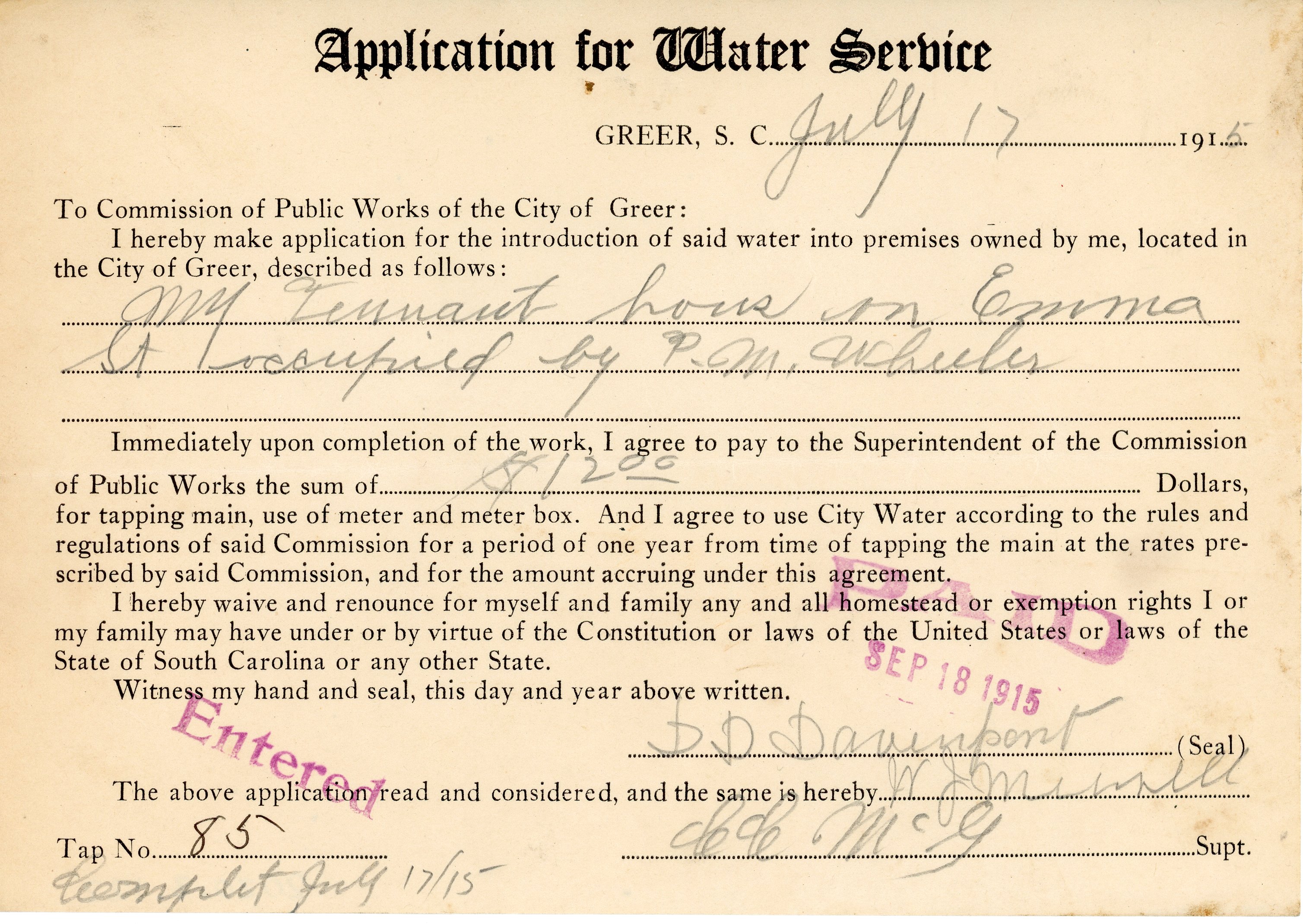- Invoice 17 July 1915 D. D. Davenport to Commission of Public Works City of Greer