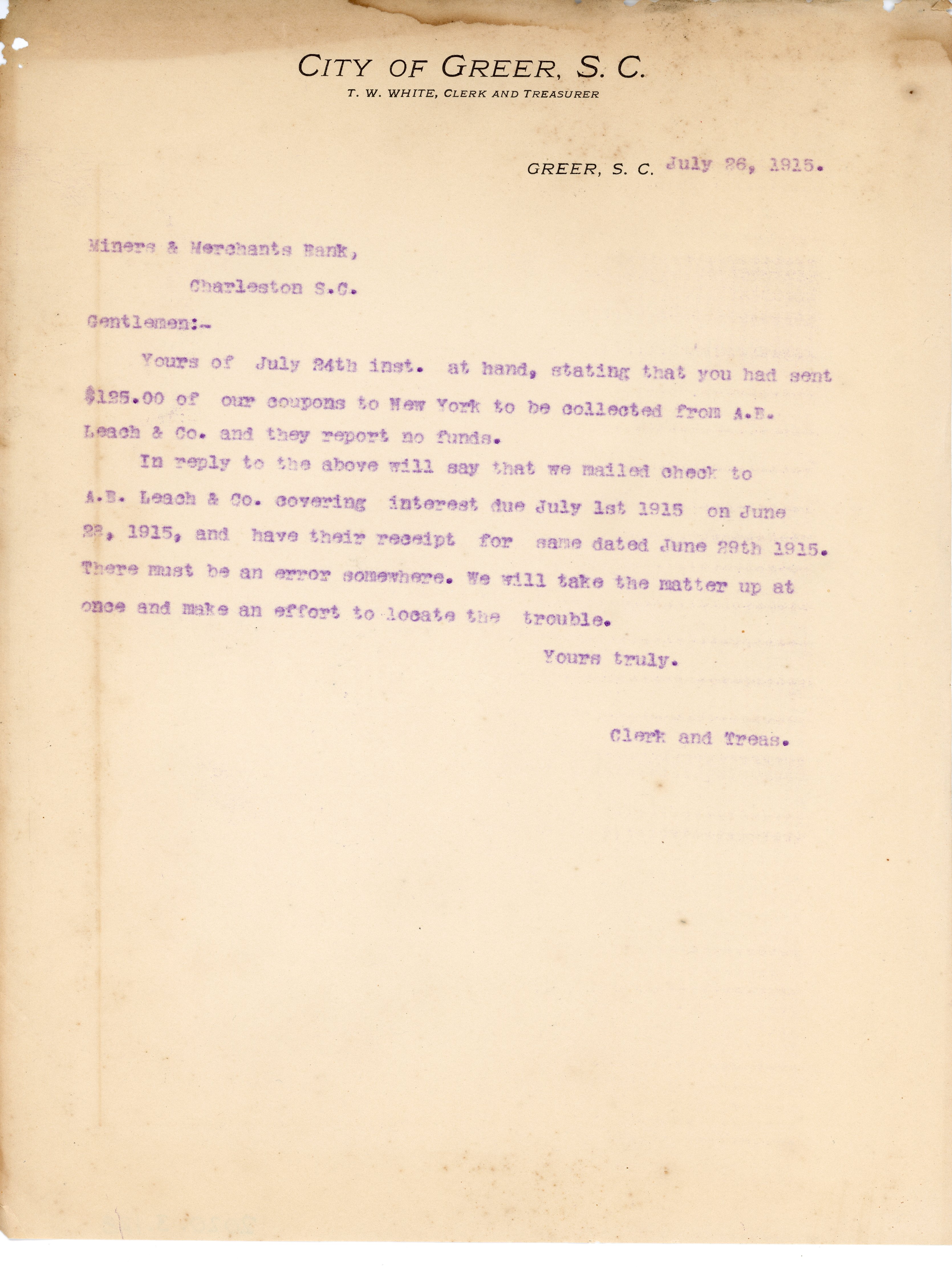 Letter 26 July 1915 T. W. White to Miners & Merchants Bank